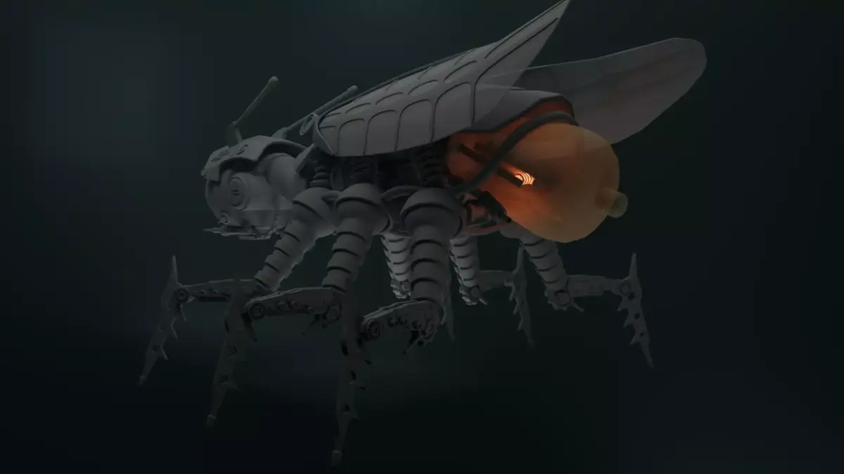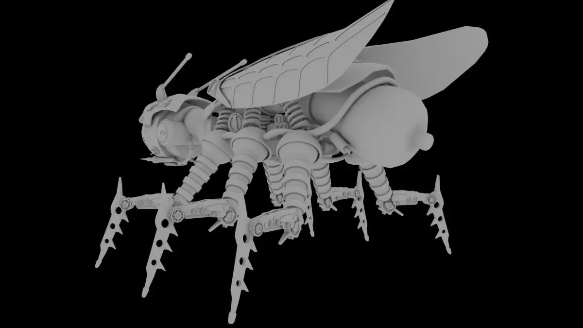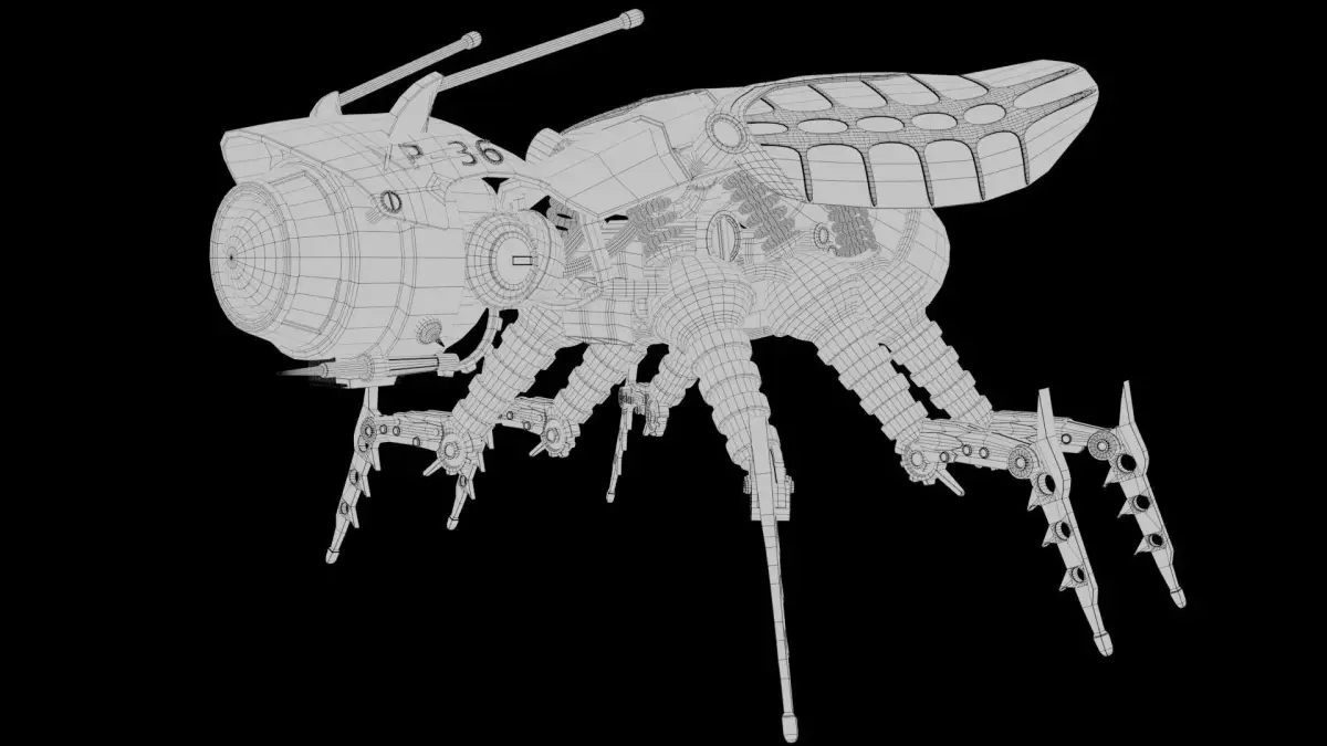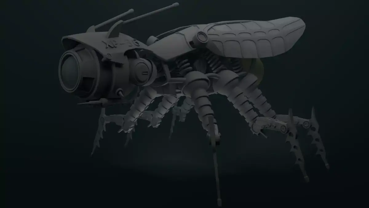 Mid-poly 3D model of a sci-fi robotic bee, designed with detailed mechanical parts and futuristic aesthetics. The model is untextured, making it ideal for customization and use in games, animations, and concept projects.