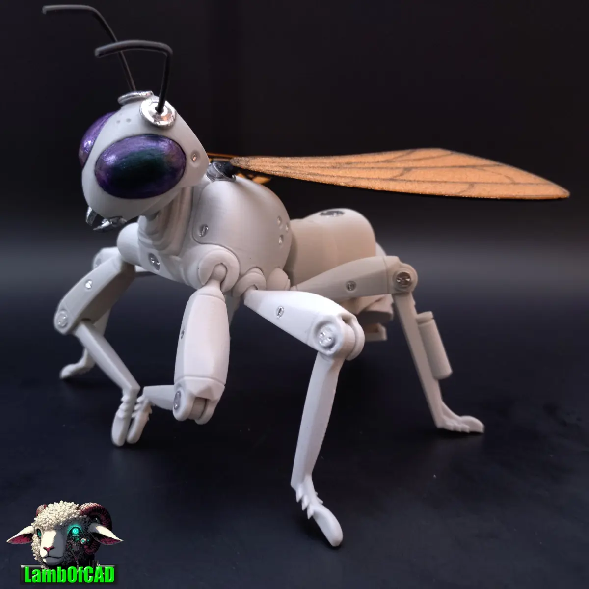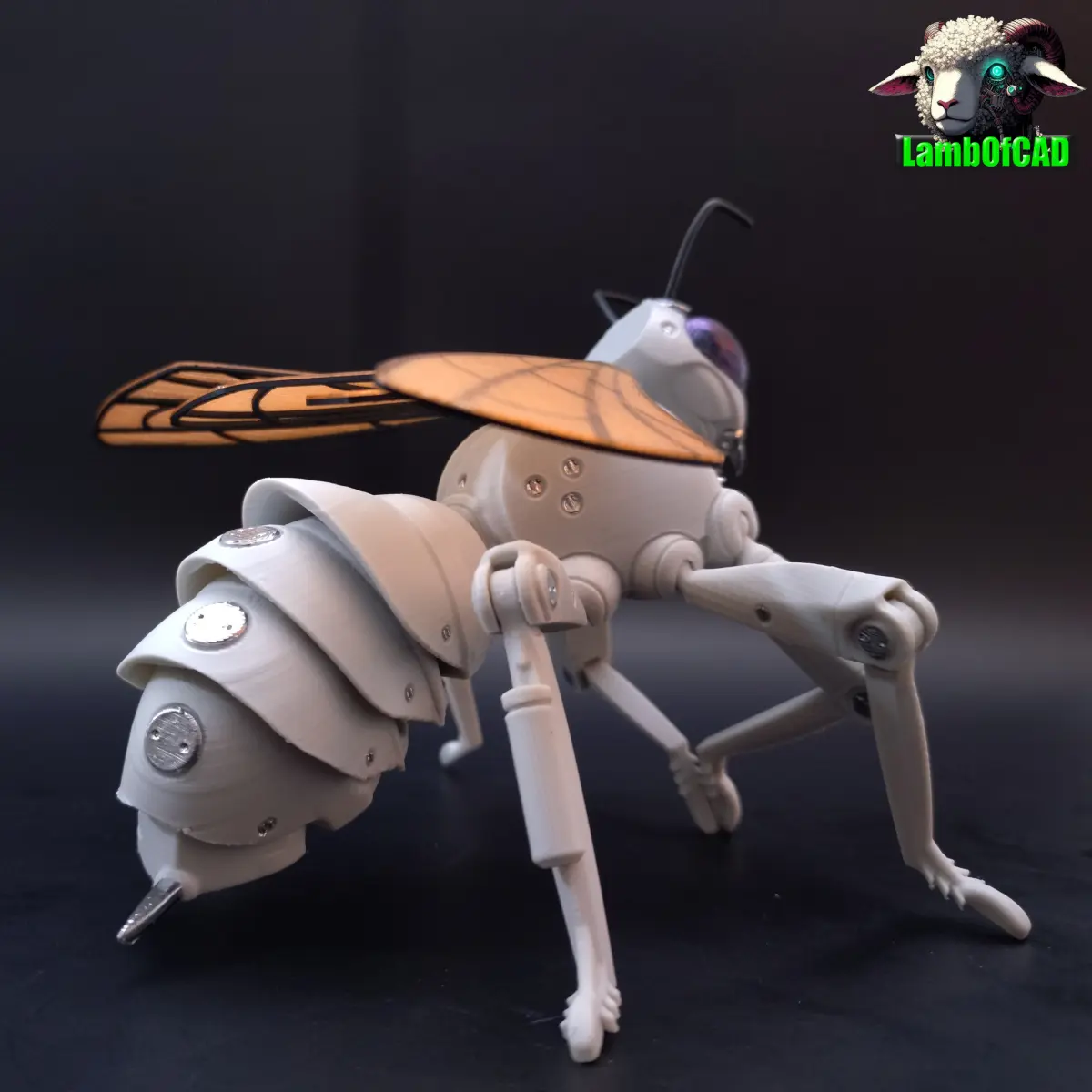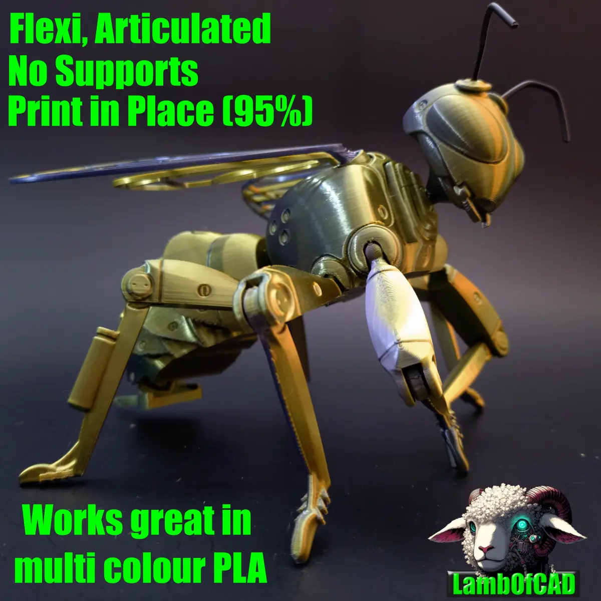 Robot Bee is a flexi, articulated print in place (95%) model inspired by a bee. It has a flexi abdomen, latching hinged knee joints, ball hinge hip joints, ball and socket neck joint and snap in ball joint wing connectors.It prints in approximately 7 hours on my P1P using a 0.12mm layer height (recommended)