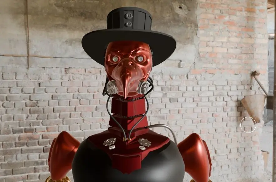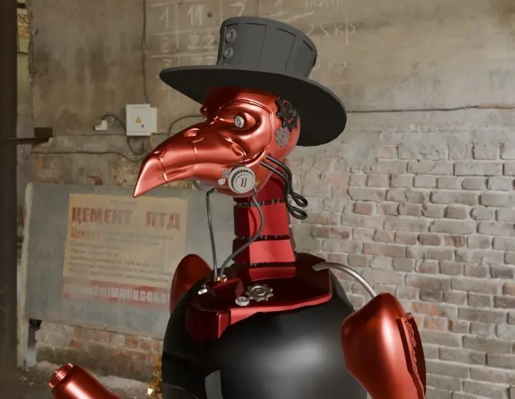 This 3D model merges a retro-futuristic aesthetic with the iconic imagery of plague doctors from history. The design features a robot with a sleek metallic body, golden arms, and a detailed head with a signature beak, reminiscent of the masks worn during the Black Plague. The addition of a stylish black hat and modern technological elements gives the character a unique personality.