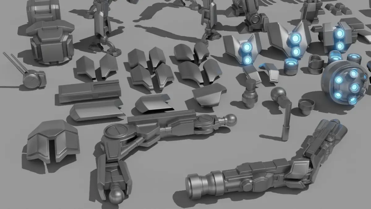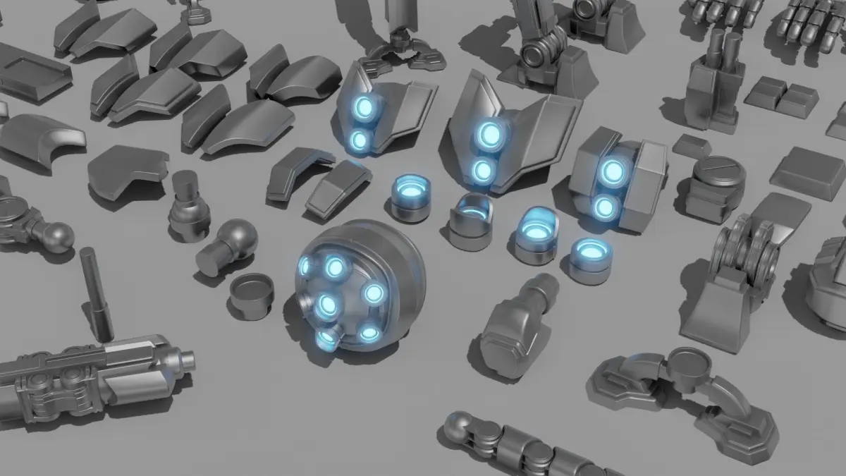 A detailed set of models to kitbash all manner of robotic creations, hinges, cameras, hands, arms, legs, anything you may need to build a robot.