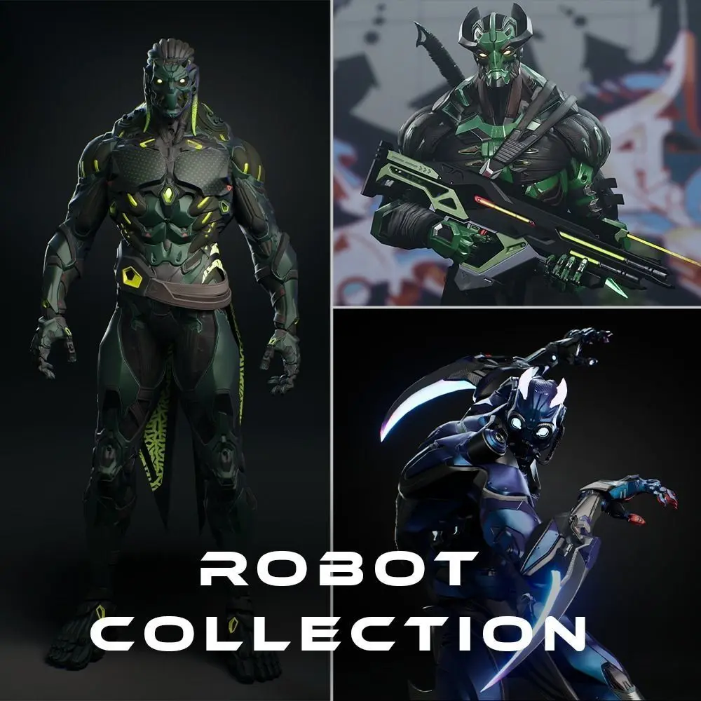 This Pack contains** 3 unique Sci Fi Robot **characters. All models rigged to UE4 skeleton.