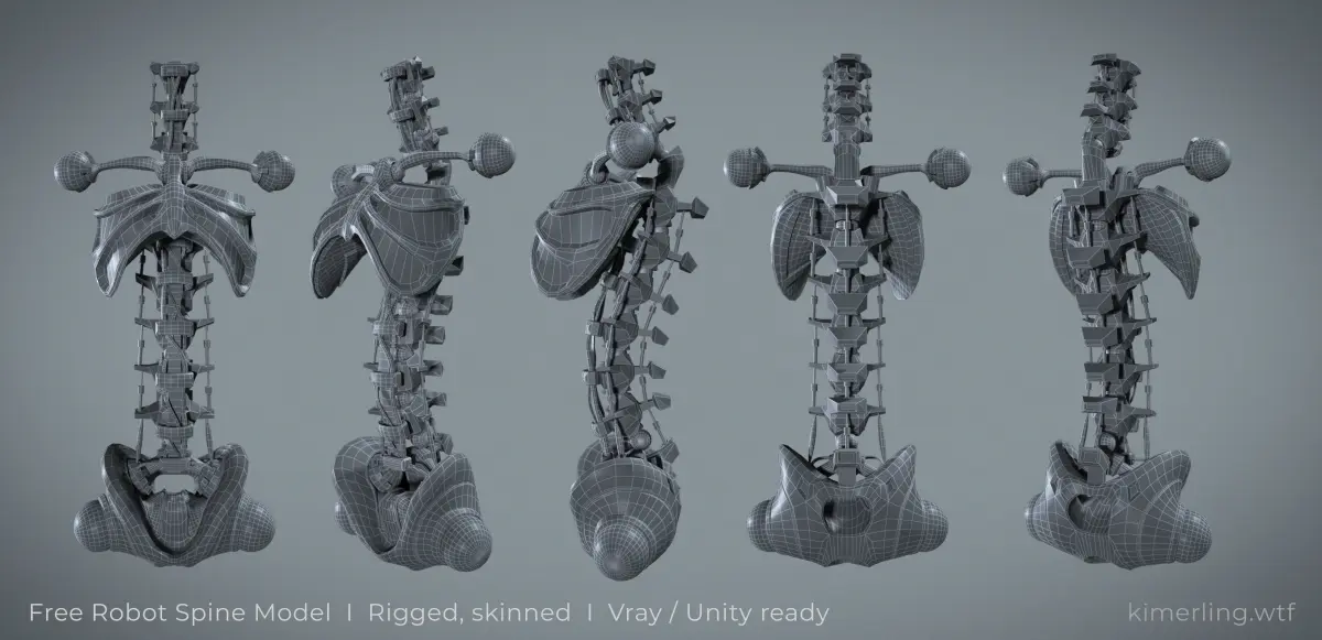 Free 3D model of Robotic Spine. Rigged and Skinned. Vray and Unity package - ready for render3Ds Max 2017 version. Rigged with standard Bipped.fbx export - rig converted to bones. obj without rig. 34, 400 Tris