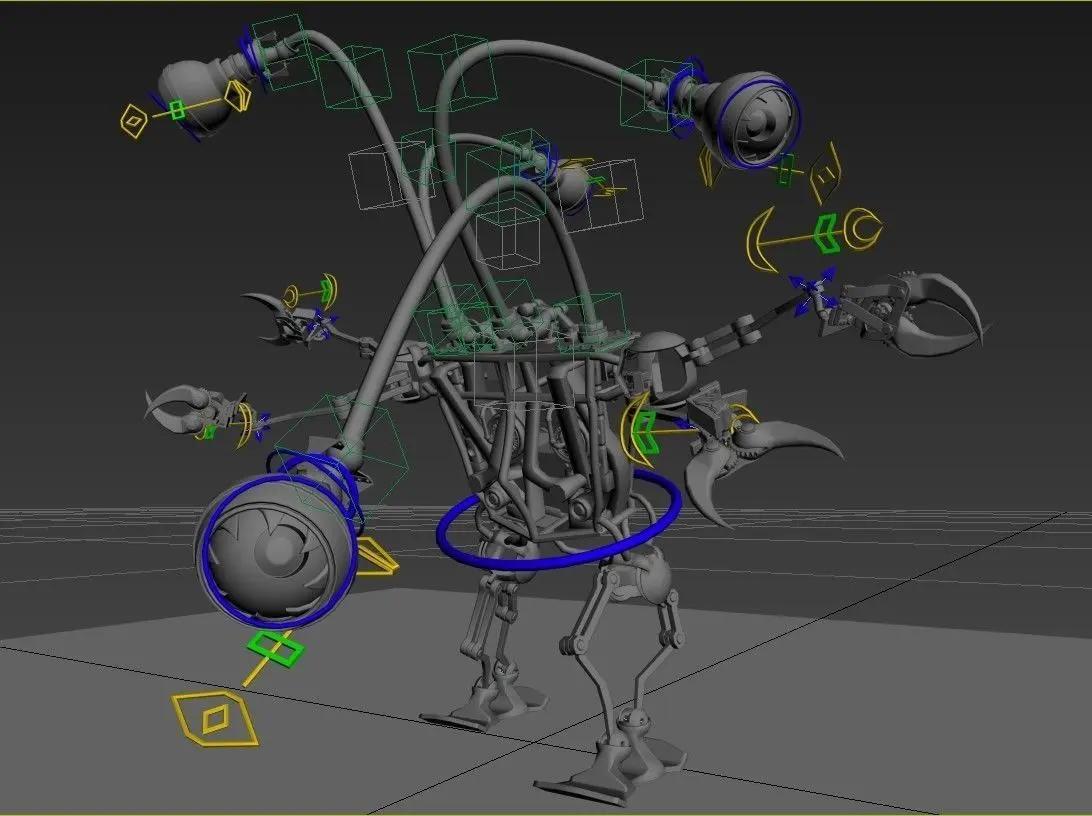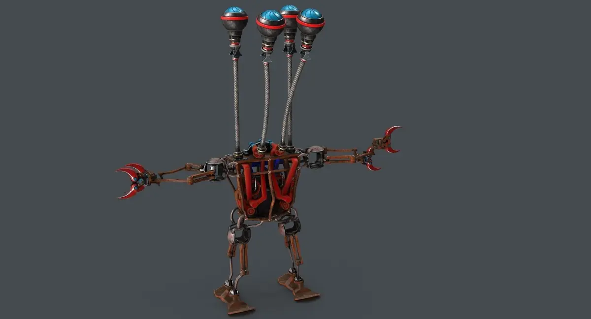 Rigged model robot with four eyes. All textures - 8kPBR materialsSmooth readyRig - custom (3ds max constraints + reaction manager)Controls on hand have freeze transforms and rotations.Rotate and transform hand with one manipulator.All parts can move.There are textures for hands, body, legs and eyes. Polycount :polys: 155108vert: 157974