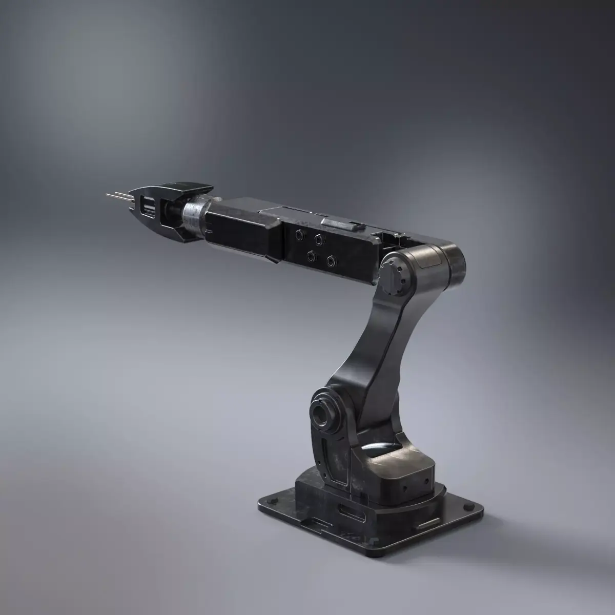 Industrial robotic arm designed in a realistic sci-fi style, featuring a solid metal construction and articulated mechanical joints. The model presents an extended arm mounted on a sturdy base, finished with a precision gripper and a slim working rod, giving it a sharp, technical appearance.
