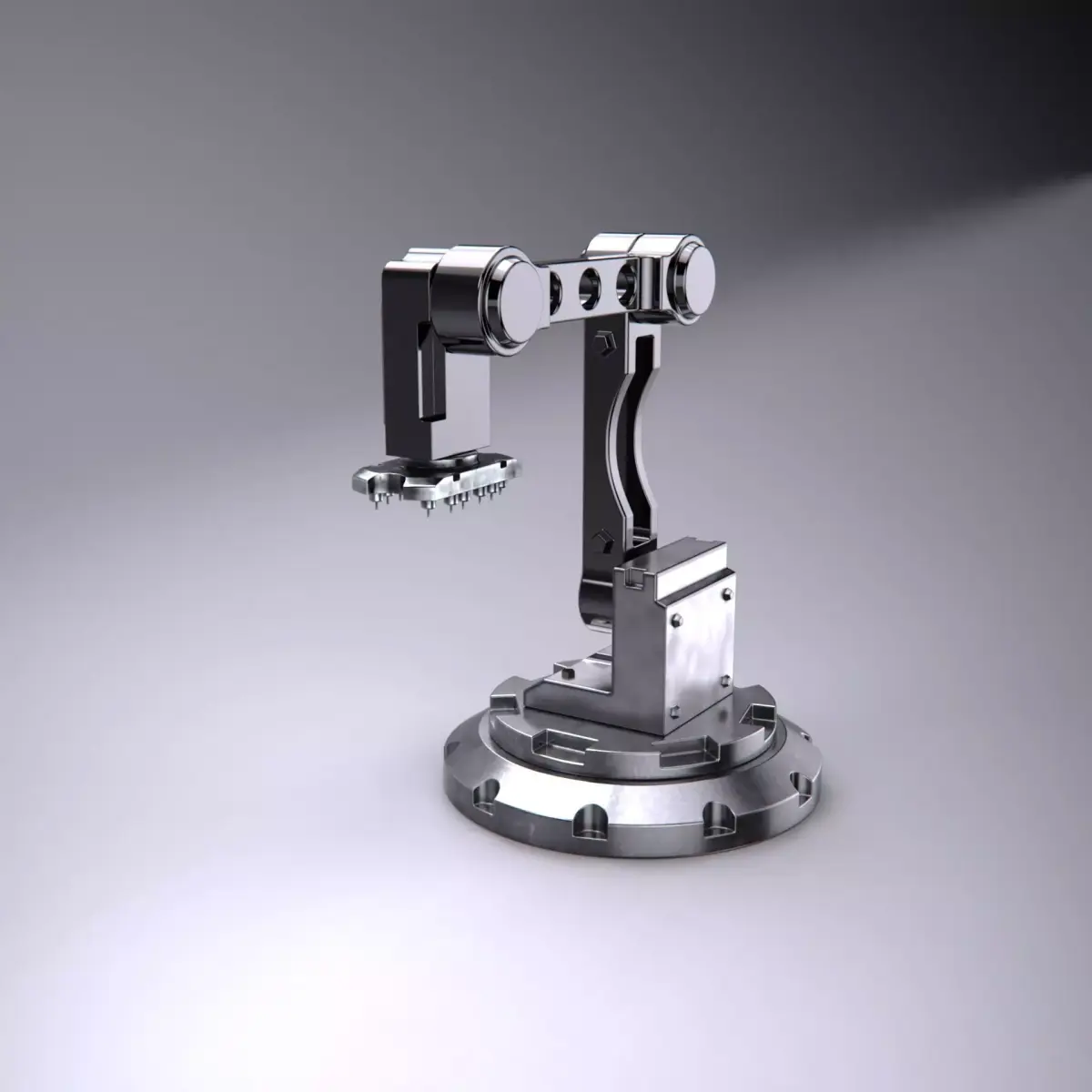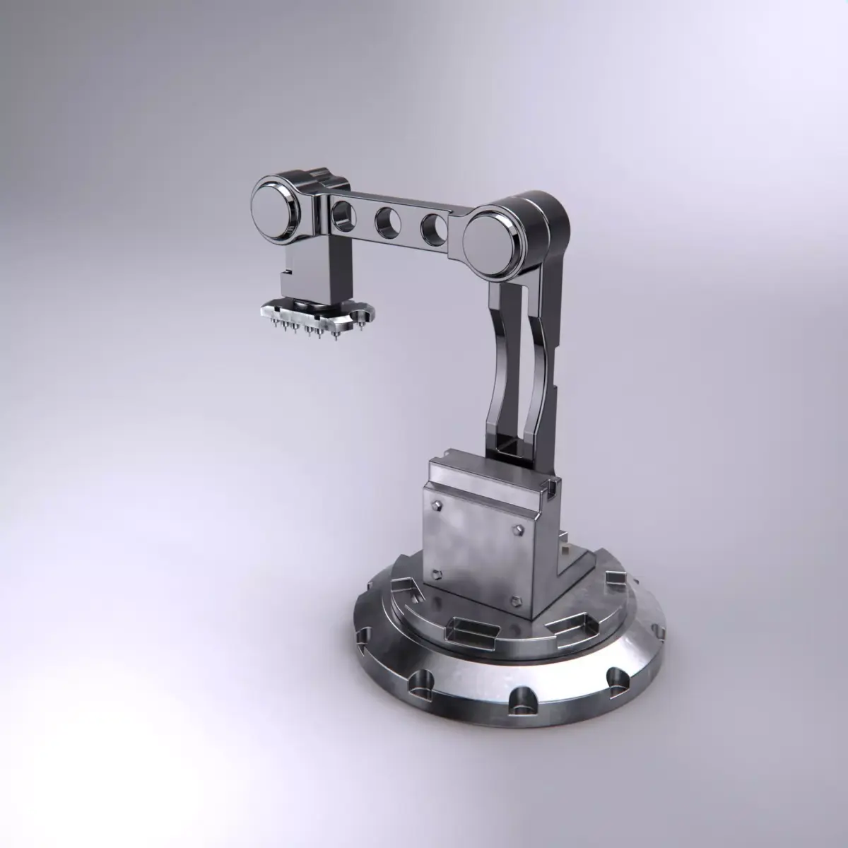 Industrial robotic arm designed in a realistic sci-fi style, featuring a solid metal construction and articulated mechanical joints. The model presents an extended arm mounted on a sturdy base, finished with a precision gripper and a slim working rod, giving it a sharp, technical appearance.