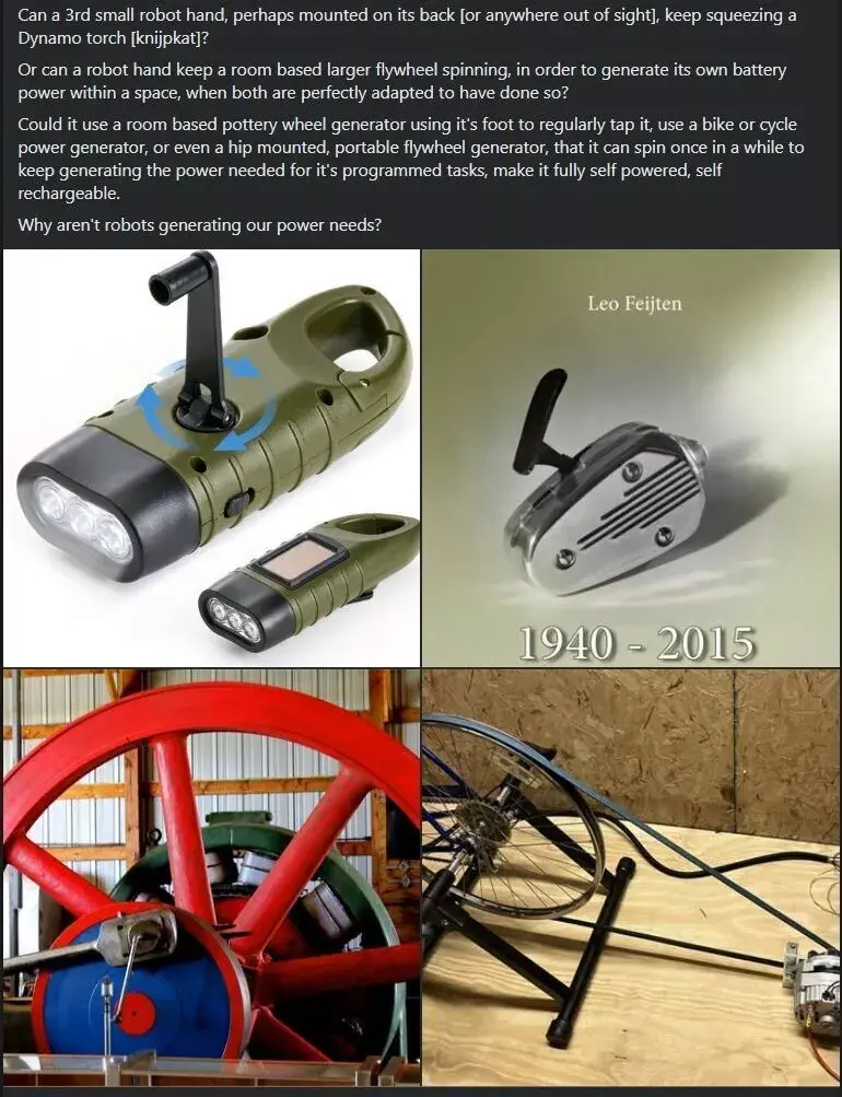 Can a 3rd small robot hand, perhaps mounted on its back [or anywhere out of sight], keep squeezing a Dynamo torch [knijpkat]? Or can a robot hand keep a room based larger flywheel spinning, in order to generate its own battery power within a space, when both are perfectly adapted to have done so?