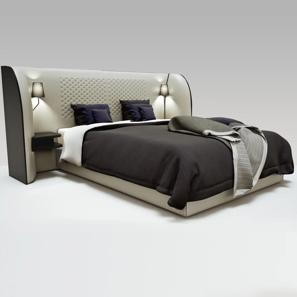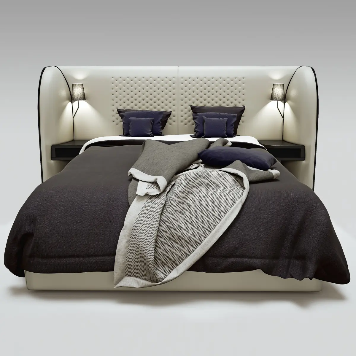 Bed upholstered in leather. Structure in solid wood and plywood, with polyurethane foam filling, headboard with overstitched motif and sides in nubuck finish.