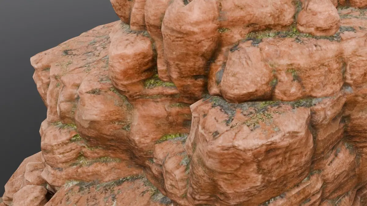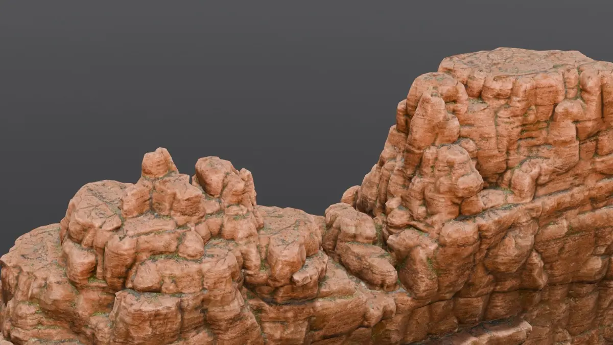 Textures have been thoughtfully applied to the model to enhance visual detail and realism, while various materials have been utilized to define the surface properties of the rock cliff, capturing its natural appearance and texture variations.