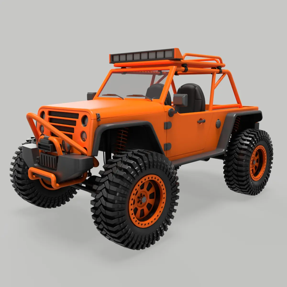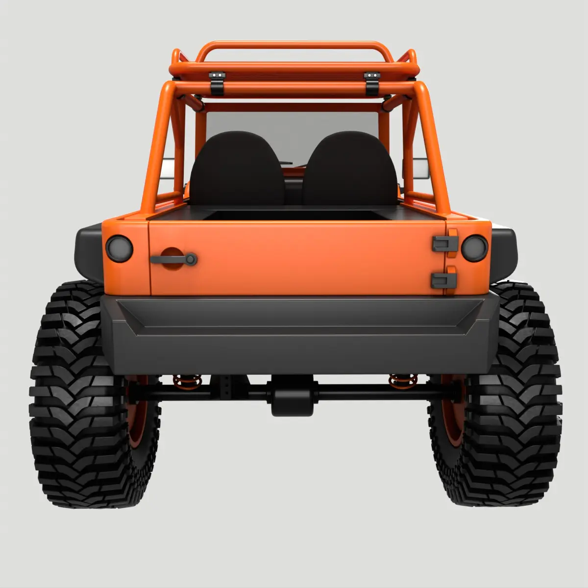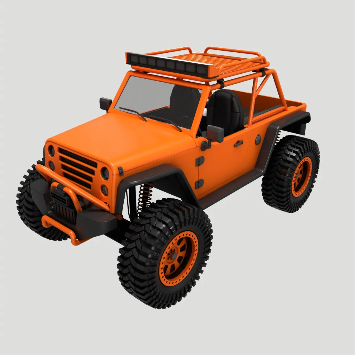 A vibrant orange rock crawler vehicle, equipped with a roll cage for added safety during extreme off-road adventures, custom fender flares to accommodate larger wheels, and a roof rack for carrying gear on outdoor expeditions.