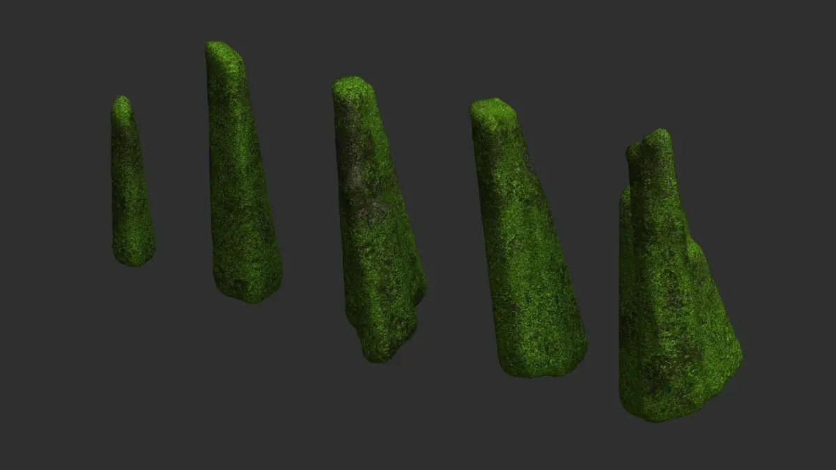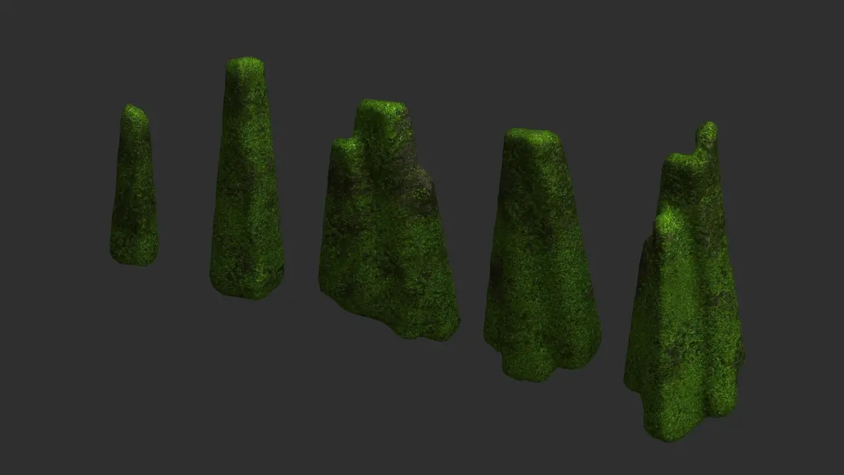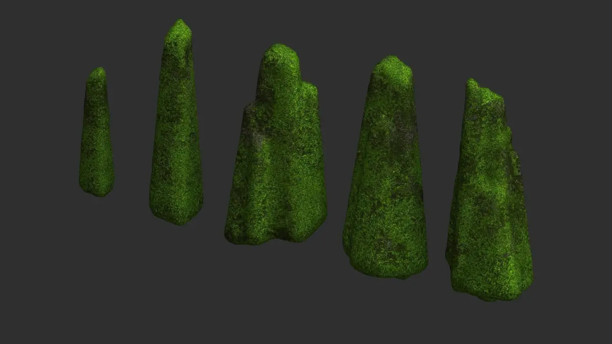 A set of 5 rocks, all sharing the same 2K texture in .png format. Textures have Diffuse, Specular, Height, and Normal maps. The models are low-poly, game-ready, watertight, and can be subdivided. Available formats are 3ds .obj .fbx .blend, and .dae. Previews were rendered in Anim8or. Blender was used for file conversion.