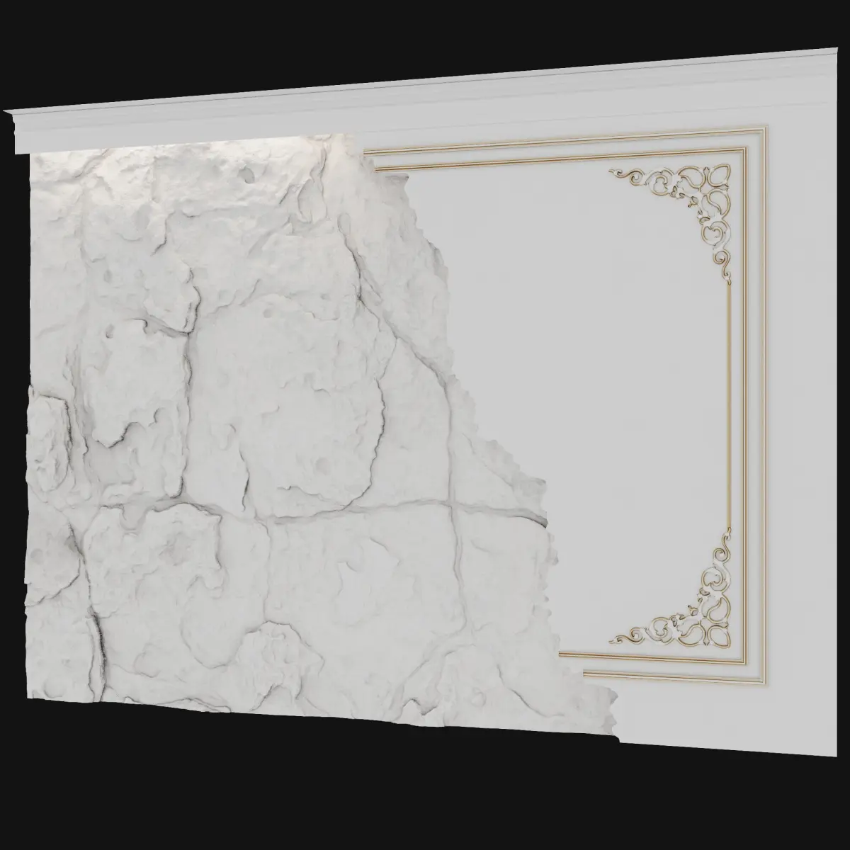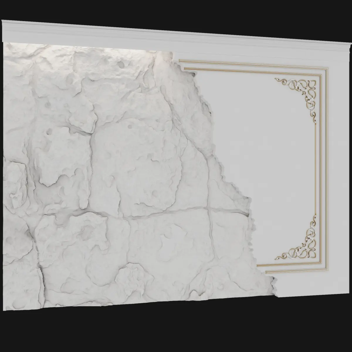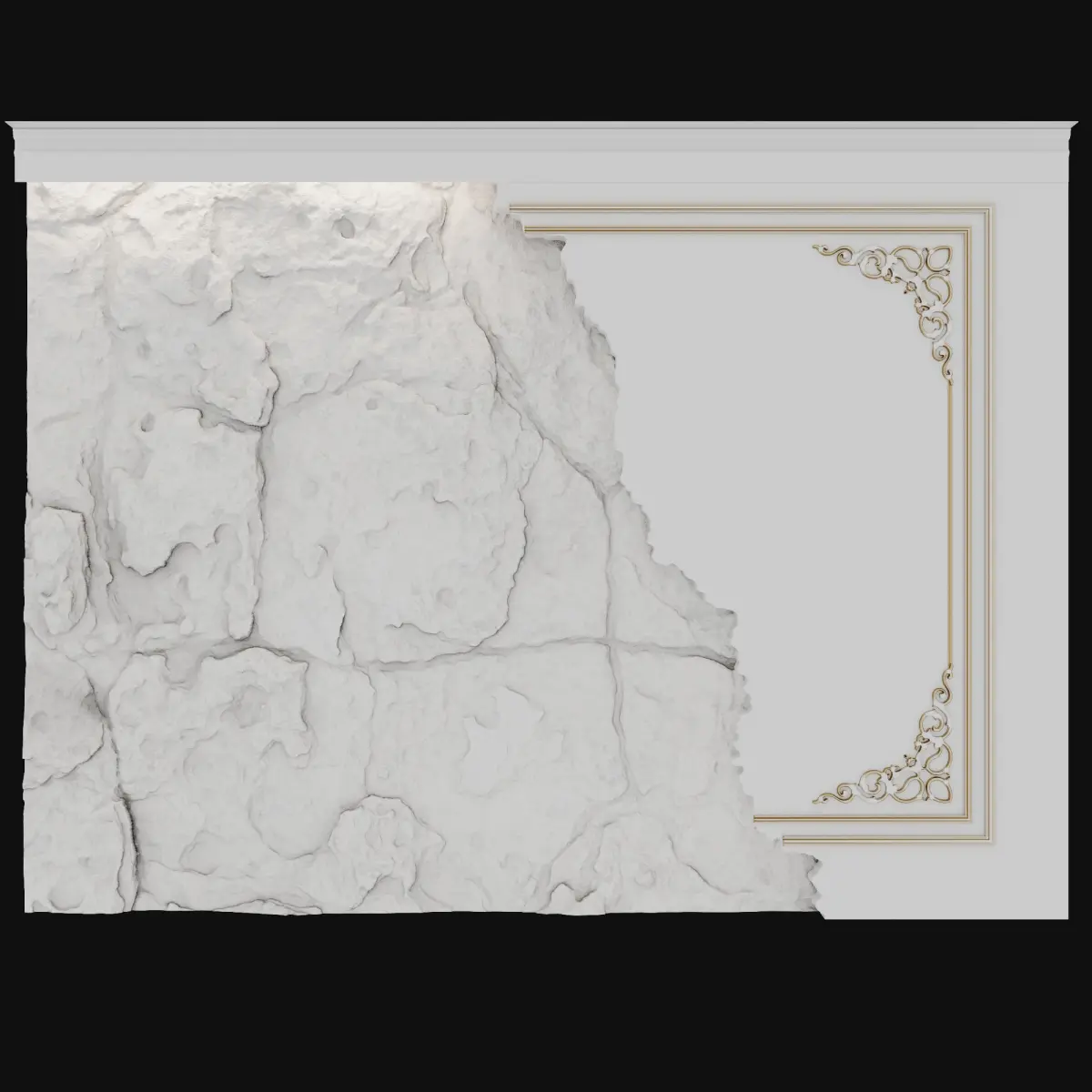 Каменная стена, переходящая в ровную стену с лепниной, которая покрыта патиной. Прекрасно впишется в разные интерьеры: от лофта до современной класски.