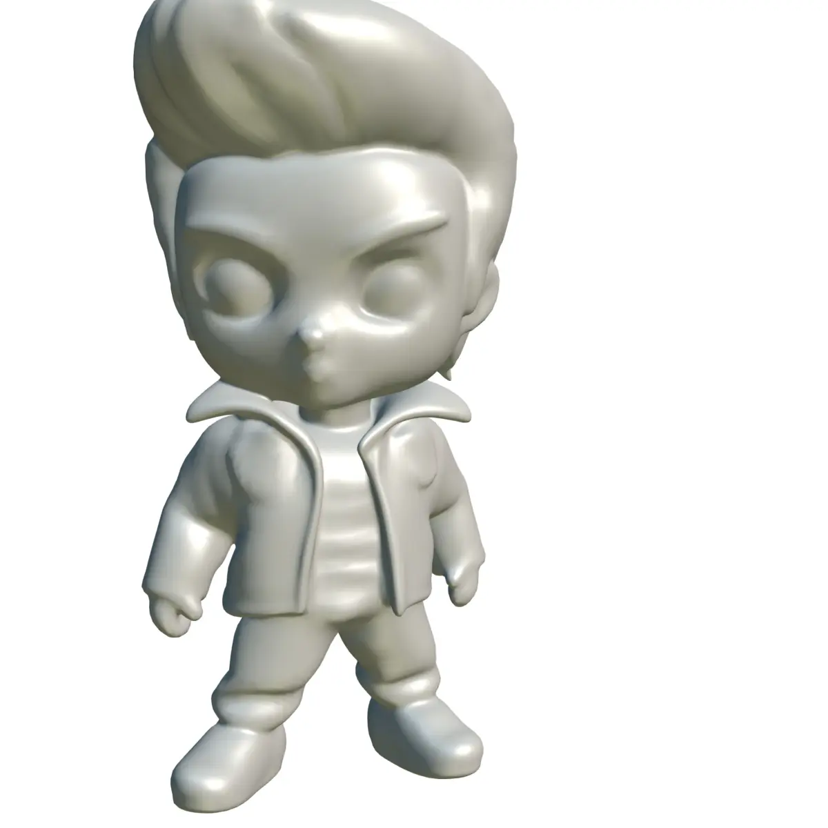 This stylized 3D character model captures a chibi figure dressed in a rockabilly-inspired black leather jacket, striped shirt, and matching sneakers. With exaggerated big eyes and slicked-back hair, this asset is ideal for use in stylized games, virtual environments, animations, or collectible-themed apps. Perfect for mobile games, NFT collectibles, and avatar-based platforms, this model can be easily integrated into various engines such as Unity, Unreal Engine, or VRChat. Available in OBJ, FBX, STL, DAE, PLY, and GLB formats with high-quality textures in PNG or JPG.