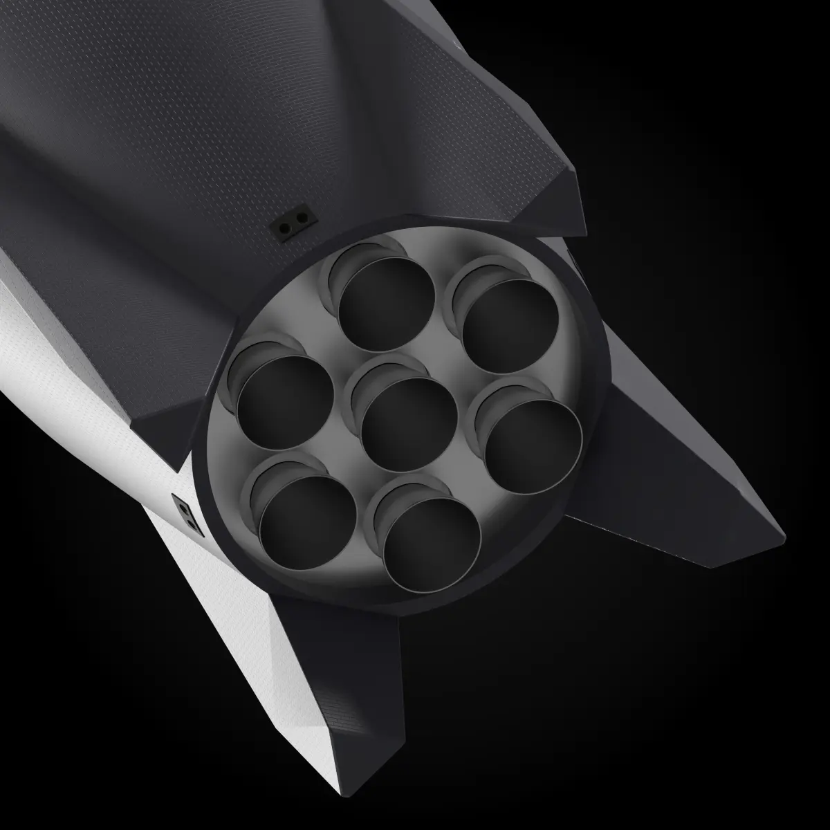 The fairing is integrated directly into the booster, simultaneously allowing easy reuse of that structure as well and allowing mass reduction on the second stage by encapsulating and structurally supporting it during booster-stage flight. Fixed-position legs serve as a combination of structural rigidity, covers for the external raceways through which electrical and data connections are routed, and as aerodynamic features to increase drag on reentry. Seven gas-generator methalox Archimedes engines power the booster, with a single vacuum-optimized Archimedes on the second stage.