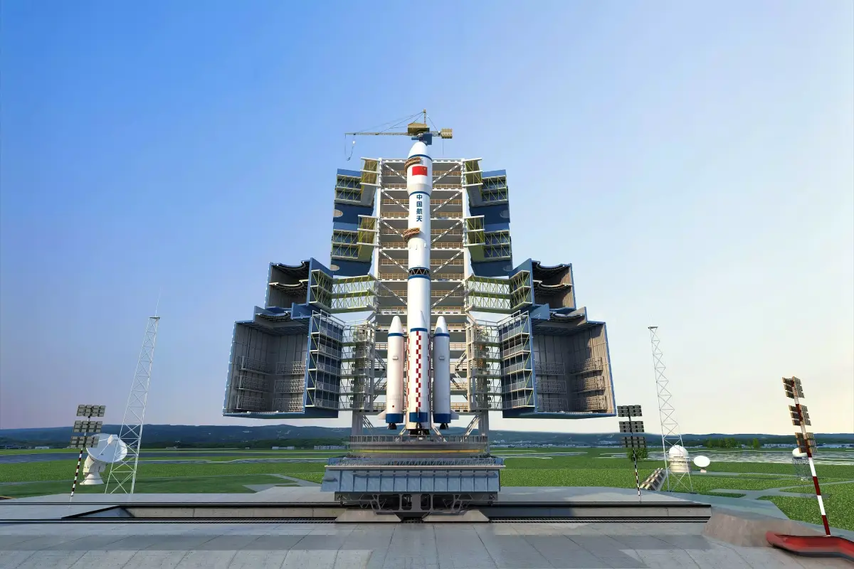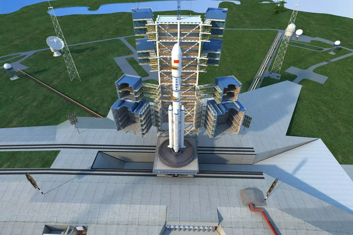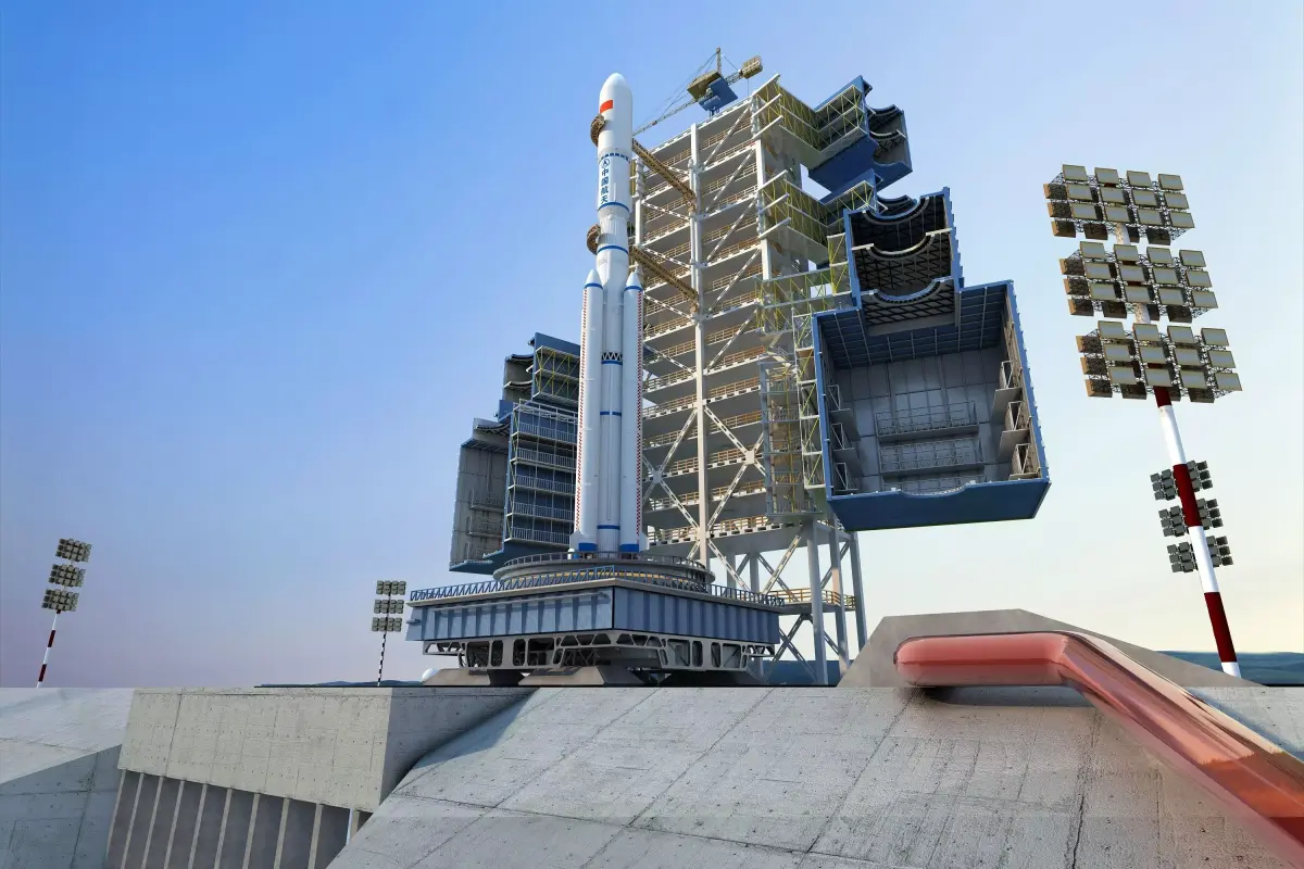 This scene depicts the launch pad of Long March 2 series carrier rockets at the China Manned Space Launch Site (Jiuquan Satellite Launch Center), fully presenting the pre-launch status of the rockets and the structure of the launch tower from multiple perspectives. The two rockets shown are both Long March 2F (CZ-2F) carrier rockets, representing different configurations of the same series. As China’s only manned carrier rocket, the Long March 2F is specially designed for manned space missions such as launching Shenzhou spacecraft and space station modules.