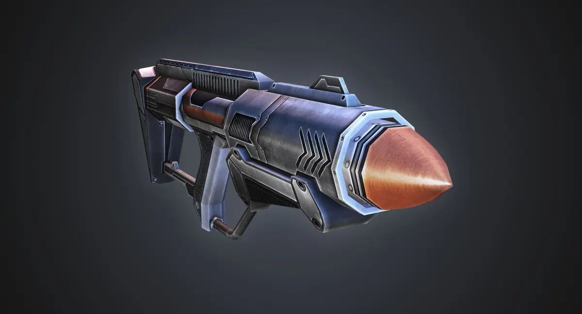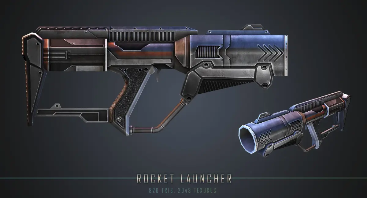 Low poly game style model of a sci-fi rocket launcher. Perfect for third person shooters or FPS games with a poly budget. Uses 2048 x 2048 hand-painted diffuse, spec, and bump maps. The rocket itself uses 1024 x 1024 diffuse, opacity, and glow maps. Rendered in scanline with three omni lights. Model is divided into 2 objects, the rocket launcher, and the projectile. Included formats: OBJ, FBX, and max.
