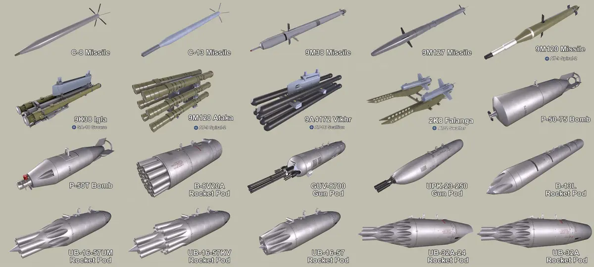 Collection of Russian rocket pods, gun pods and missile launchers for attack helicopters.