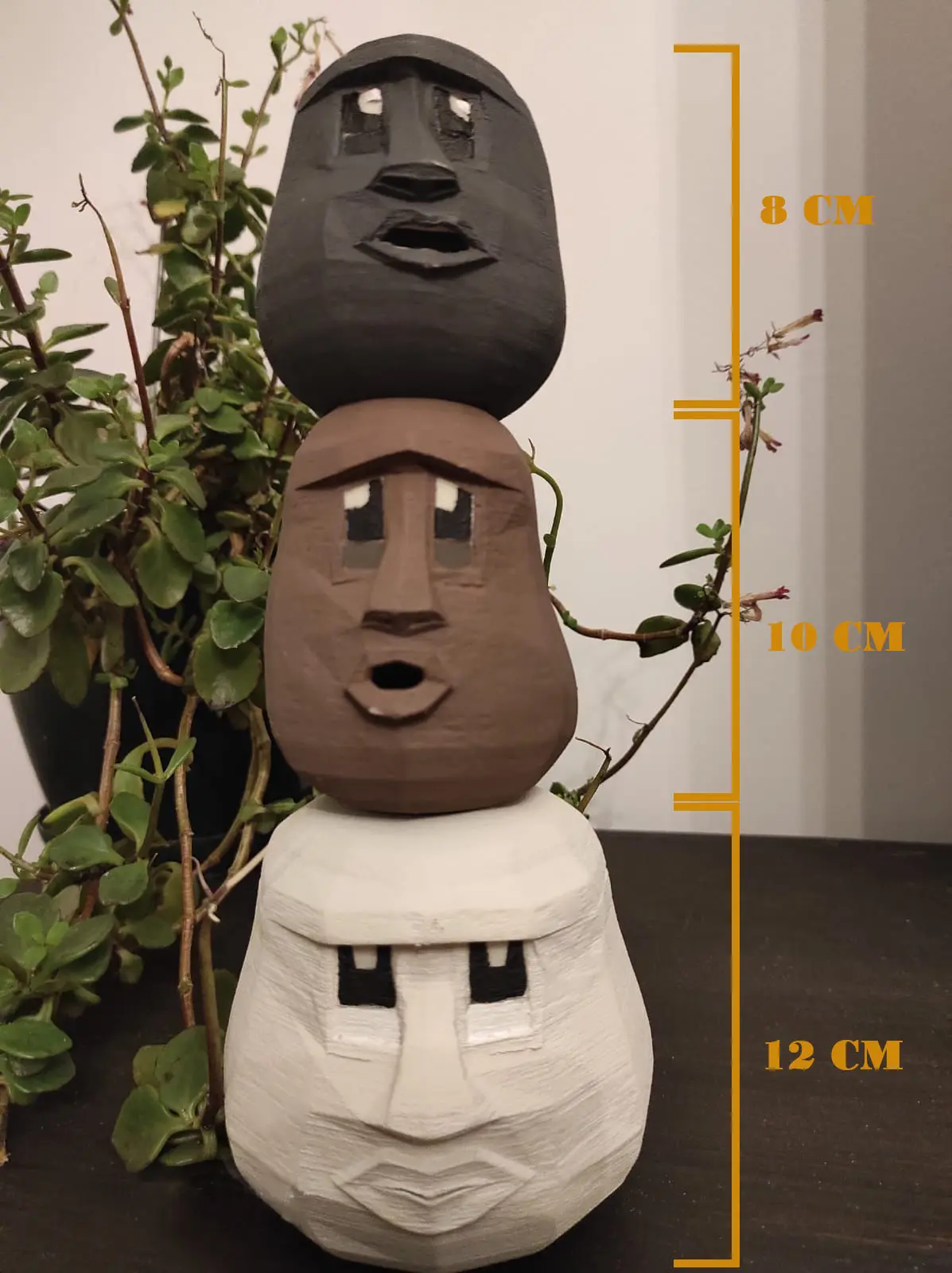 They express their reactions to carrying the fire. Little one is scared, medium is baffled but the big one is confident like human stages.Printed with SLS printer. I would be glad if you give me your feedbackThickness: 2mmLittle Rockhead; width: 8 cm, depth: 8 cm, height: 8cmMedium Rockhead; width: 7 cm, depth: 7 cm, height: 10 cmBig Rockhead; width:10 cm, depth: 10 cm, height: 12 cm