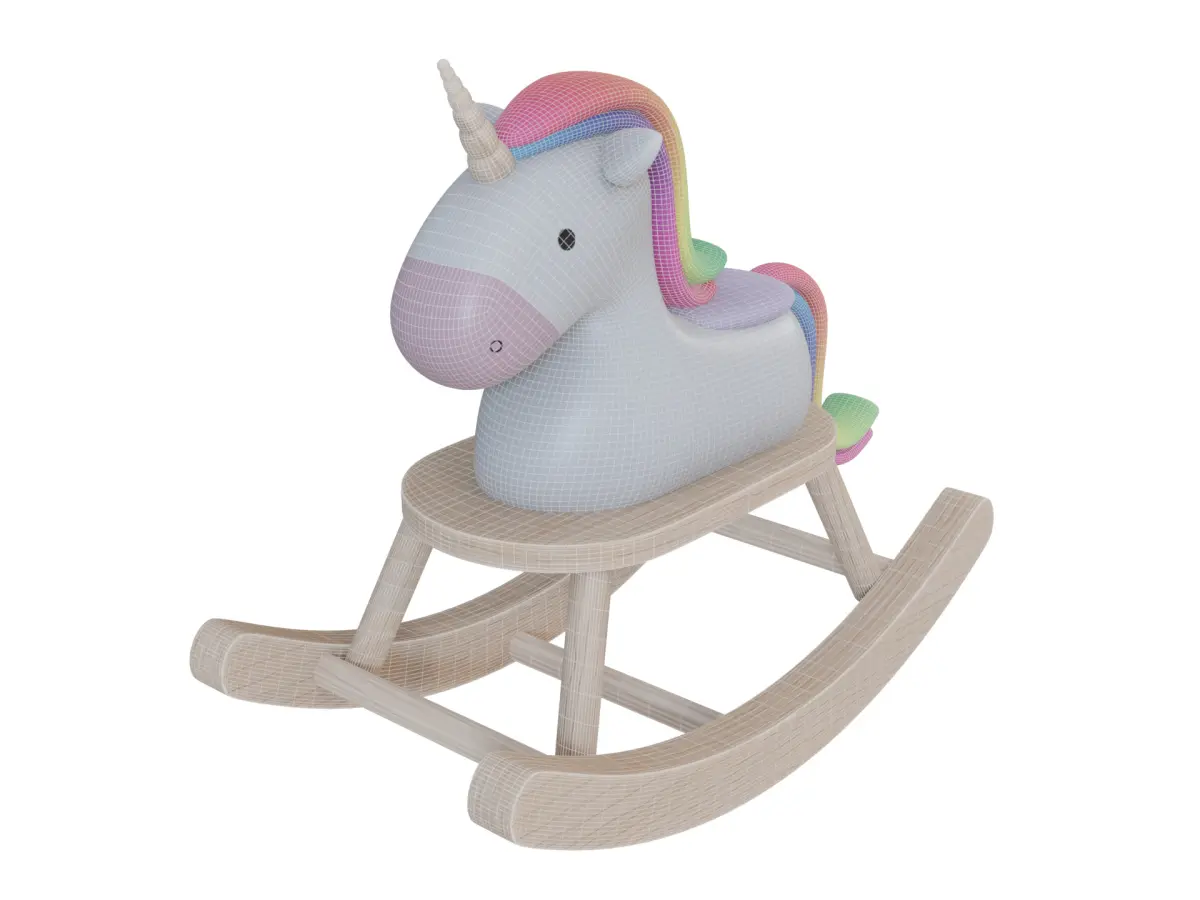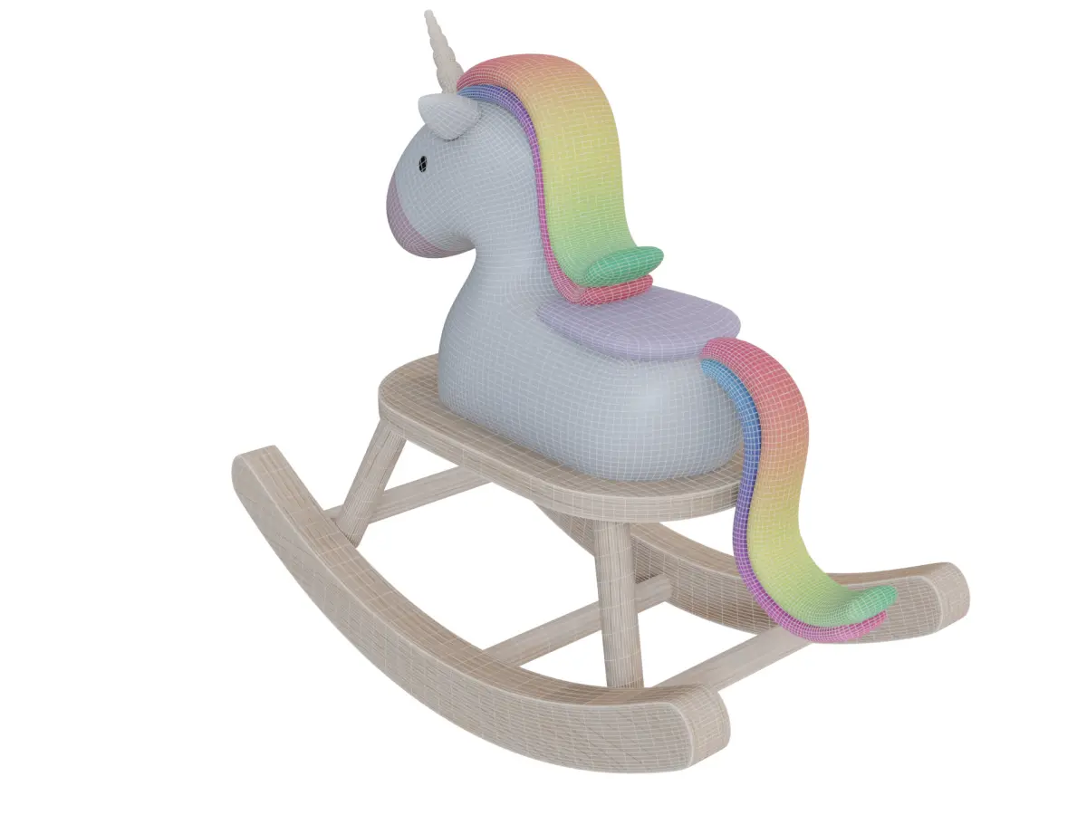 A whimsical rocking ride-on toy for kids, featuring a vibrant rainbow color scheme with soft pastel hues, a sturdy wooden base, and a plush unicorn seat, perfect for imaginative play in the current era.