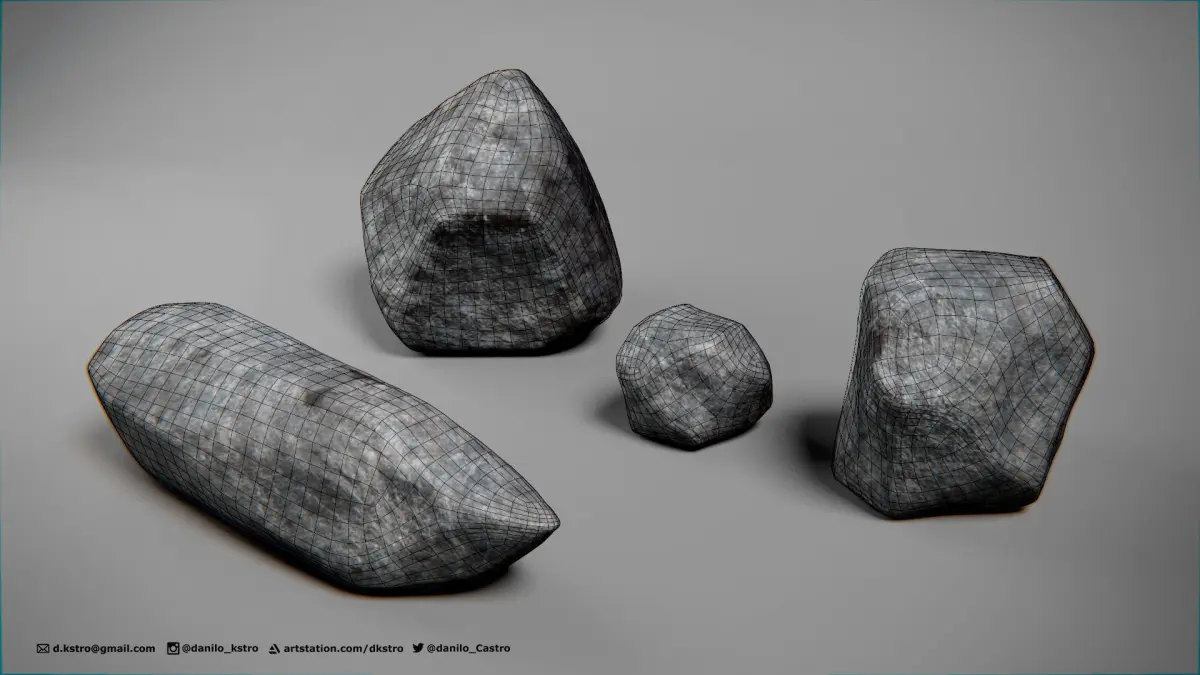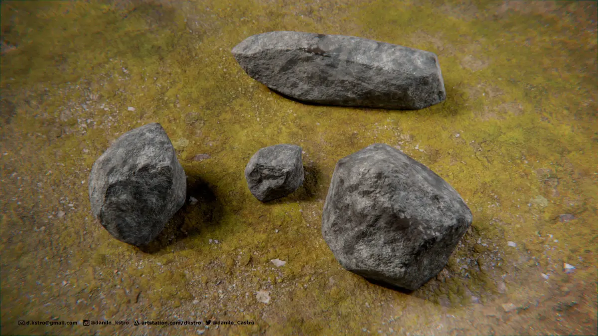 Rocks, simple models to be used in scene composition or outdoor environments. I produced the 3D models using Blender and Substance Painter, The 3D models have the UV mesh open and 2k texture maps for each model.Rendering and compositing were done in Cycles and Blender composer.
