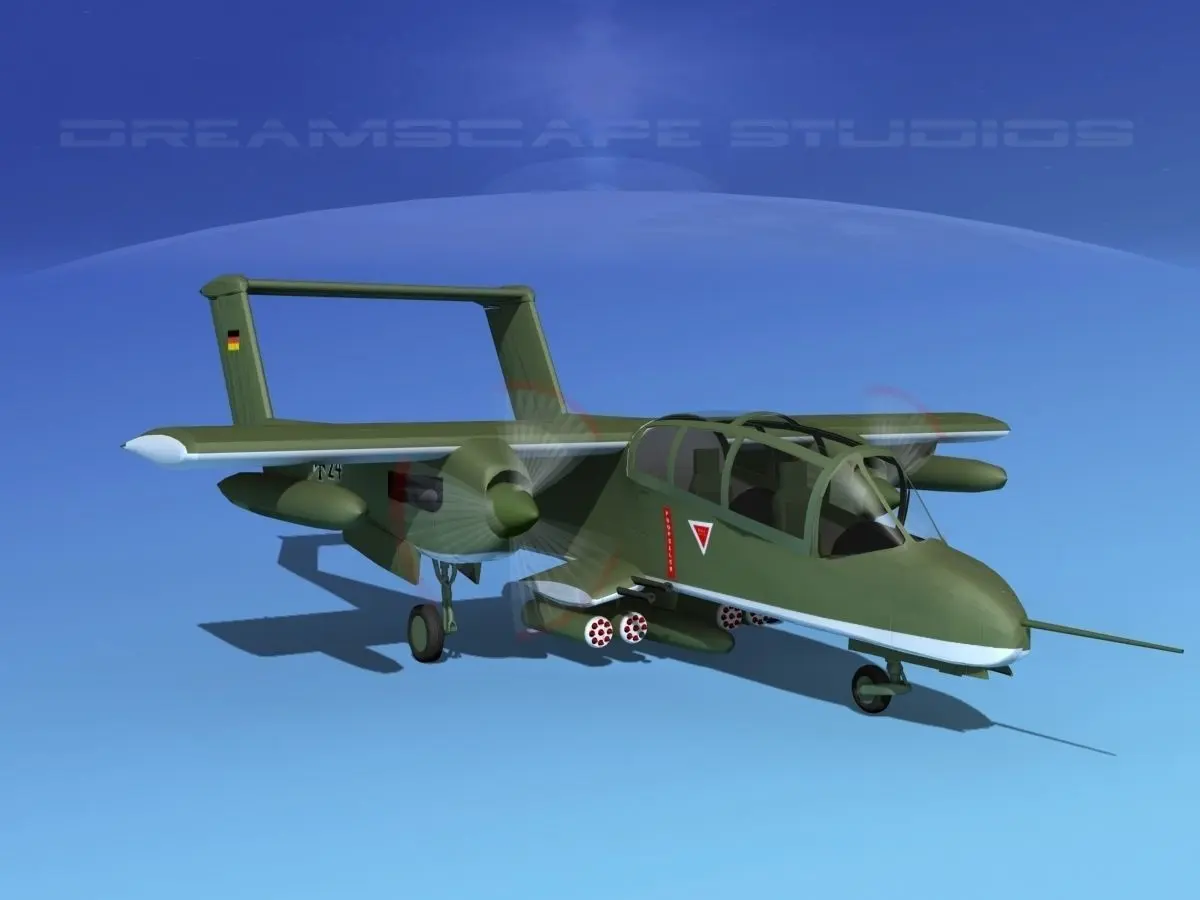The model was built near to scale in real units and based on real dimensional information, drawings, photos, and other documents. It was recently upgraded and updated with better textures, better geometry for much of the model and better renderings. This model includes animated propellers, animateable ailerons, flaps, elevators, landing gear, landing gear doors. It comes in several variants including the US Army basic version, USAF version, US Marines, NASA and two other air force versions. The models come in 8 formats, all the ported formats are prepared well to work correctly with every standard modeling software. The model is fully textured with all materials UVW mapped and applied. Most materials are planar mapped and major materials include texturing. All textures and materials are included as shown. 3ds Max model parts are grouped for easy selection, and objects are logically named for ease of scene management. No cleaning up necessary, just drop your models into the scene and start rendering. No special plugins are needed to open scene.In most cases the liveries are based on actual service liveries or paint schemes. Many of the countries who flew the plane are represented here. These models render very well and look very realistic using good animation and rendering technique. It can be used in an animated or static position within an animated video or possibly for programming for a flight simulation application. This model was not designed for 3d printing, these are digital files only. The North American Rockwell OV-10 Bronco was an American military light armed observation and COIN fighter, designed in the 1960s. It had twin Garrett T76-G-410/412 Turbo Prop turning a thee blade variable pitch propeller. They were crewed by a pilot and weapons controller/ observer. It was operated by the United States, Malaysia, United Kingdom, Thailand, Indonesia, Germany France, Philippines, and Belgium.