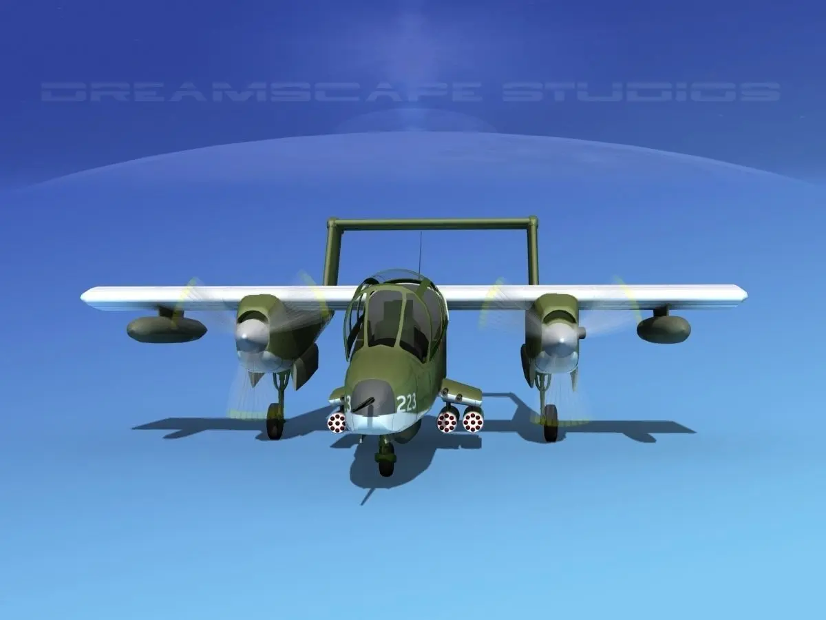 The North American Rockwell OV-10 Bronco was an American military light armed observation and COIN fighter, designed in the 1960s. It had twin Garrett T76-G-410/412 Turbo Prop turning a thee blade variable pitch propeller. They were crewed by a pilot and weapons controller/ observer. It was operated by the United States, Malaysia, United Kingdom, Thailand, Indonesia, Germany France, Philippines, and Belgium