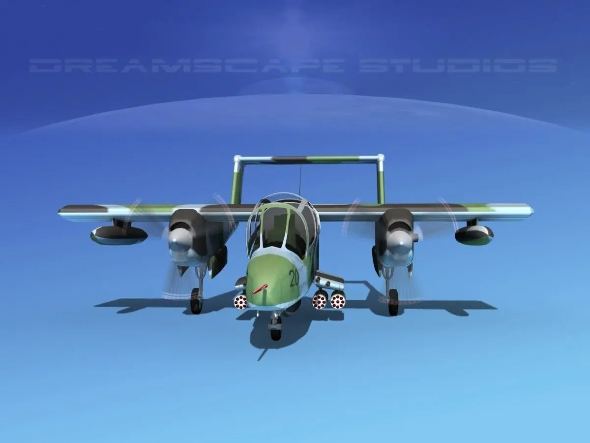 The North American Rockwell OV-10 Bronco was an American military light armed observation and COIN fighter, designed in the 1960s. It had twin Garrett T76-G-410/412 Turbo Prop turning a thee blade variable pitch propeller. They were crewed by a pilot and weapons controller/ observer. It was operated by the United States, Malaysia, United Kingdom, Thailand, Indonesia, Germany France, Philippines, and Belgium.