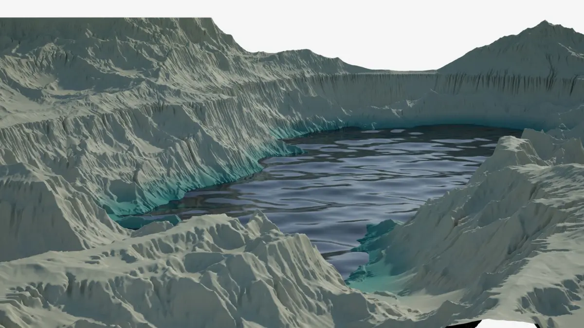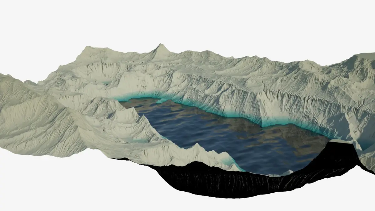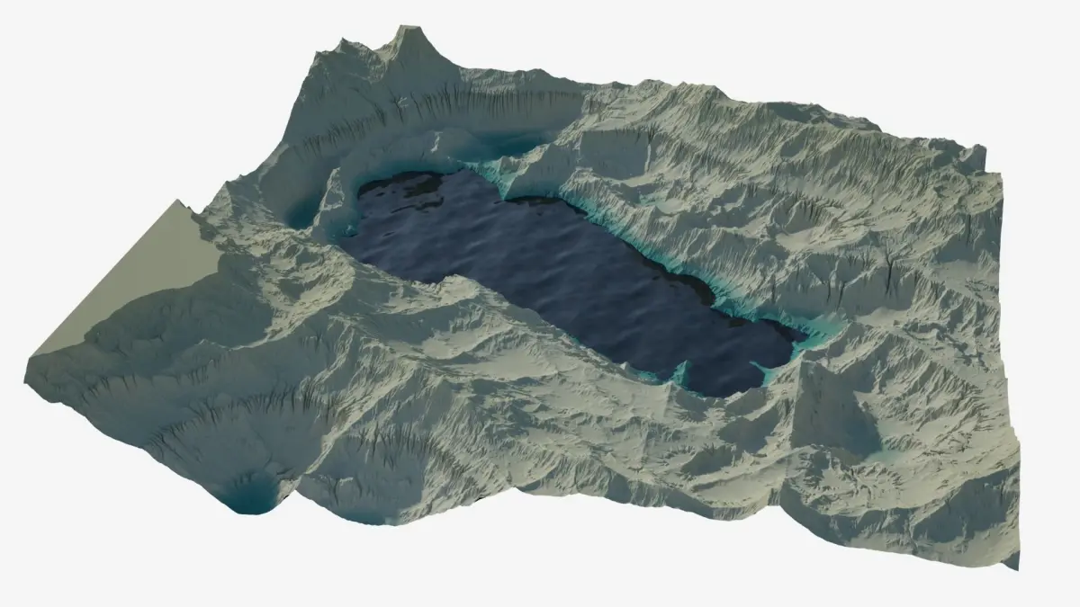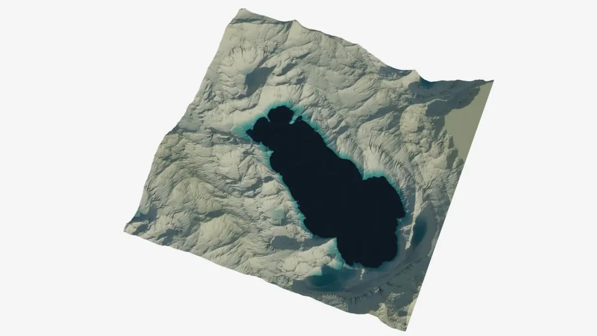 Highly detailed terrain. Rocky hills and valleys with a body of water.The water is a quad polygon plane with a V-Ray material (VRayMtl).Clean geometry, all quads.