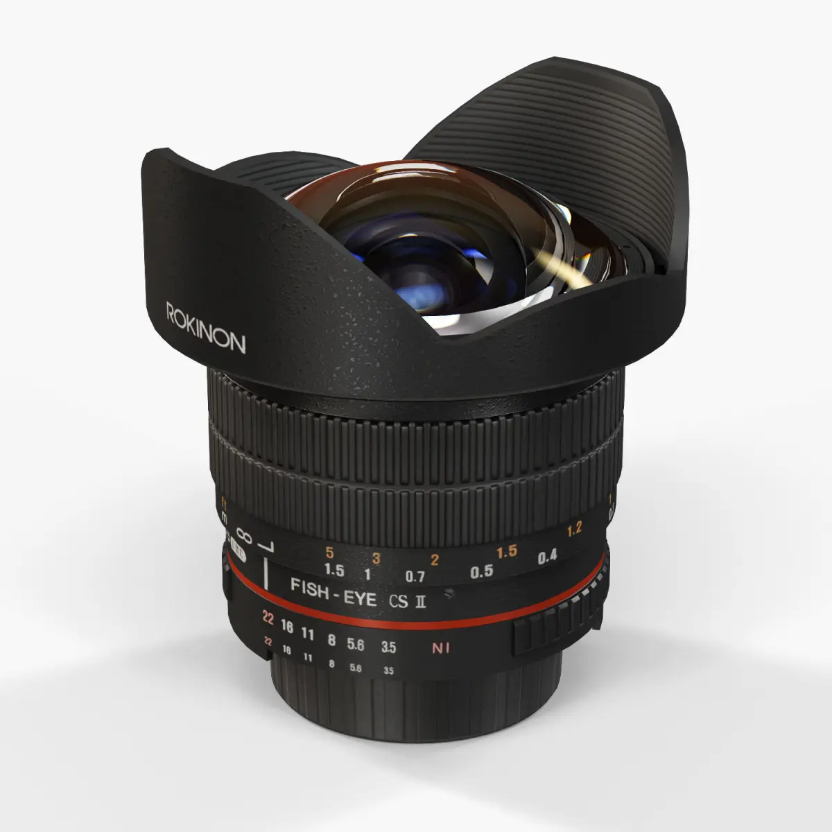 • Let me present to you high-quality low-poly 3D model Rokinon 8mm f/3.5 AS IF UMC Fish-eye CS II AE Nikon F mount Lens. This model can be used in various fields 3D Graphics such as game development, advertising, interior design, motion picture art, visualization, etc... Modeling was made with ortho-photos of real lens that is why all details of design are recreated most authentically.
