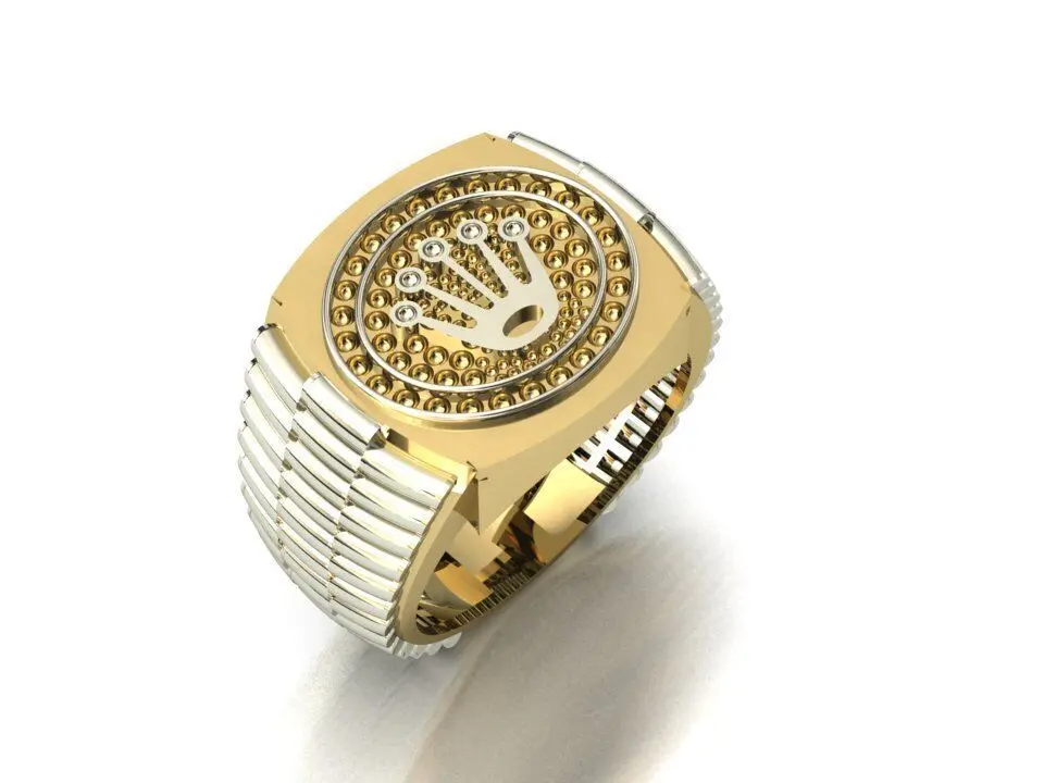 **This Rolex men's ring with a unique and luxurious design is a combination of yellow and white gold. The top of the ring is oval-shaped and decorated with a sparkling gem, which gives it a special look. Its chain design and special texture show a sense of power and style. This ring is suitable for use on special occasions and as a stylish accessory.