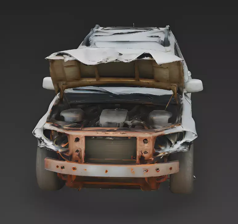 Severe Frontal Impact and Engine ExposureA primary feature of this model is the significant structural damage to the front end, including a warped, wide-open hood that reveals a rusted and partially dismantled engine block. The front bumper and grille assembly are completely missing, showing jagged metal edges and exposed internal components to provide a clear visual indicator of a high-velocity impact for close-up inspection.