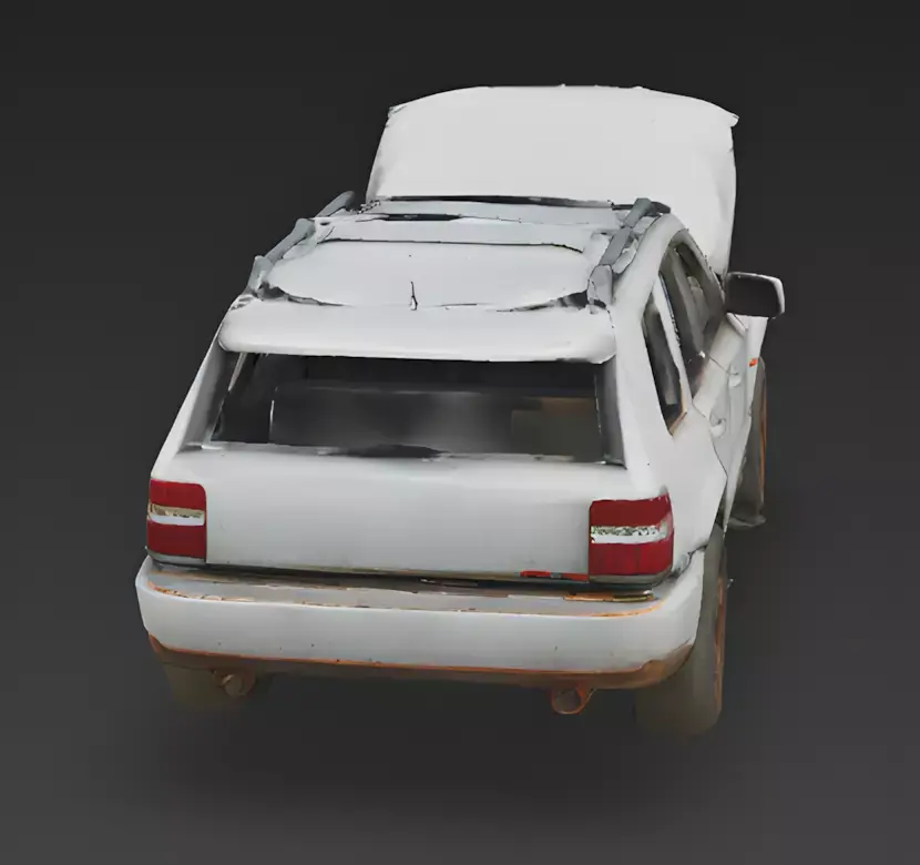 Extensively Weathered and Rusted FinishThe SUV features a uniform, matte white finish that is heavily compromised by realistic surface decay. The texture is layered with thick orange rust streaks, significant metallic oxidation, and accumulated urban grime, providing a professional and grounded appearance that maintains a consistent look across various dynamic lighting conditions.