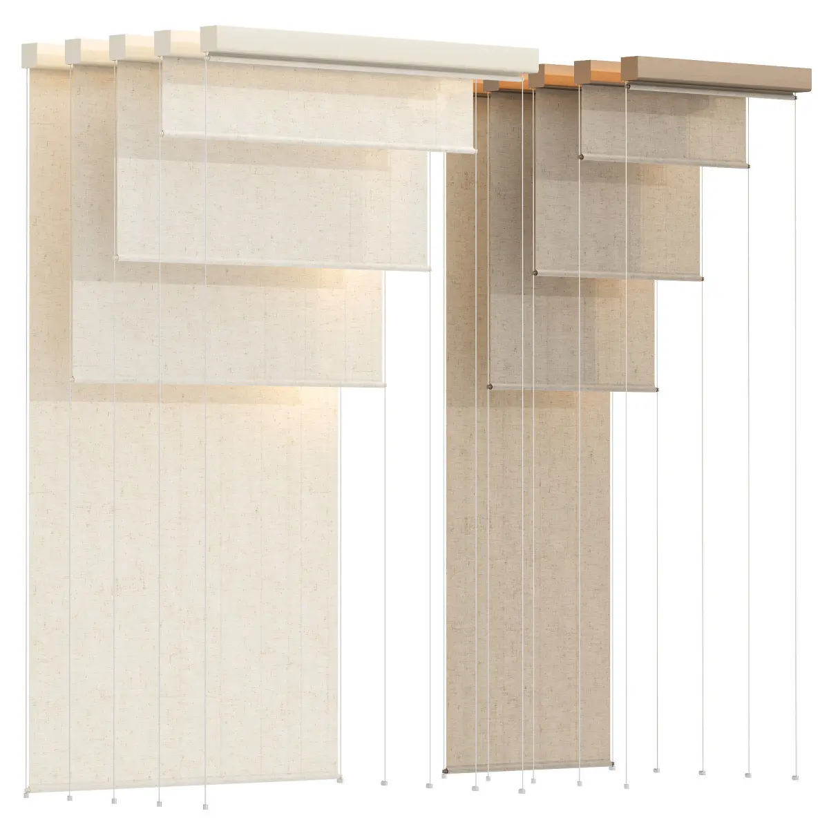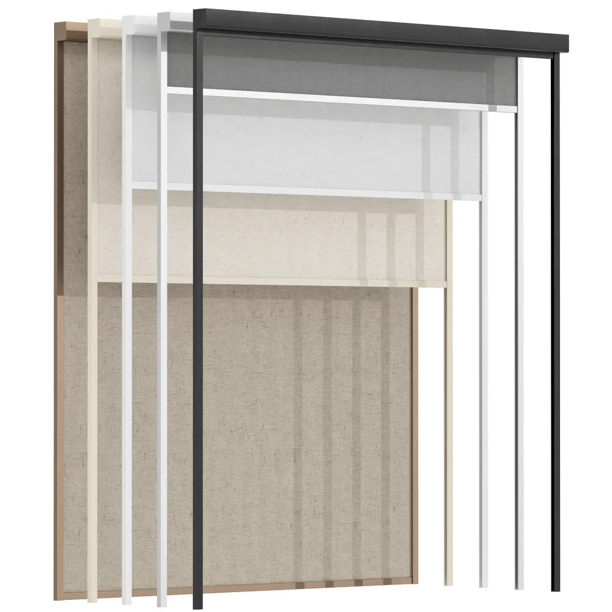 There are 40 objects of Roller Blinds in the archive. 4 types of width. And 5 opening positions. 5 materials with different colors.