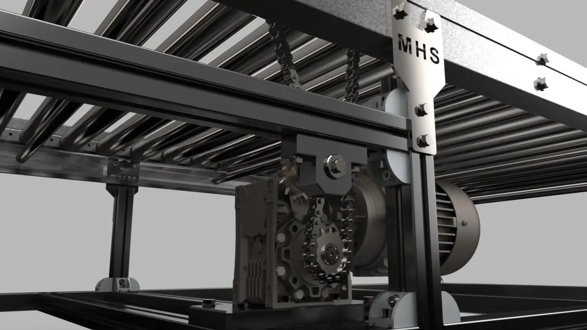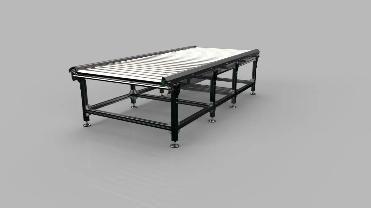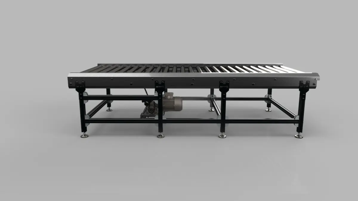 Chain driven roller conveyor. It is installed on a Sigma profile chassis. The gear code used is 08b1 z14. The drive motor used is ev50 case 110 rpm reducer motor. The roll diameter used is 60 mm and the width is 1000 mm. Carrying capacity is maximum 1500 kg. Side sheets can be used as 4 mm stainless steel or painted st-37 quality sheet.