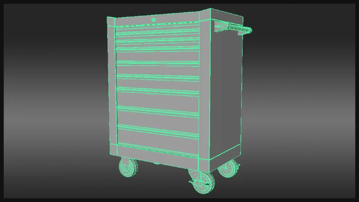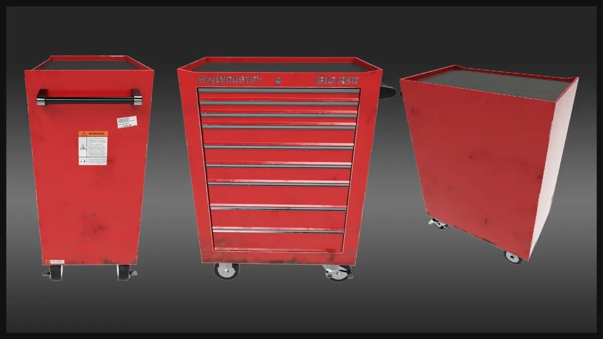 A rolling tool cabinet that would fit believably in any projects involving worn or used industrial machinery, workshops, or garages.