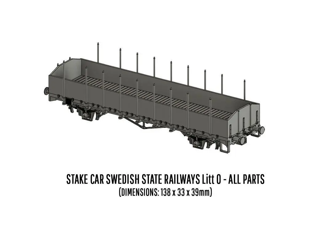 *** This 3D-set requires a minimum print surface length of 150mm of your resin 3D-printer***Full set of STL-files to build a Swedish state railroad stake car Litt O in H0-scale. Runs well on both 2- and 3-rail systems.The car is equipped with standard sized NEM-pockets, which allows for any NEM-couplings of your choise.In addition you need: 2x wheel pairs (WHEEL DIAM: 10.3mm SHAFT LENGTH: 24.6mm)2x NEM springs (size 2.0mm diam, 4.0mm length, 0.1 - 0.2mm wire diameter)13 gram metal plate to be glued under flatbed floor as ballast (max 50 x 15 x 0.8mm).