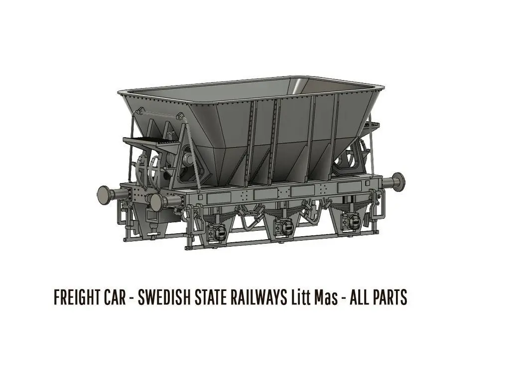Full set of STL-files to build a Swedish state railroad Iron ore car Litt Mas in H0-scale. 1740 units were built 1950-1953. In duty on Malmbanan in Lappland until 1985.Runs well on both 2- and 3-rail systems.The car is equipped with standard sized NEM-pockets, which allows for any NEM-couplings of your choise.In addition you need: 3x wheel pairs (WHEEL DIAM: 10.3mm SHAFT LENGTH: 24.6mm)2x NEM springs (size 2.0mm diam, 4.0mm length, 0.1 - 0.2mm wire diameter)