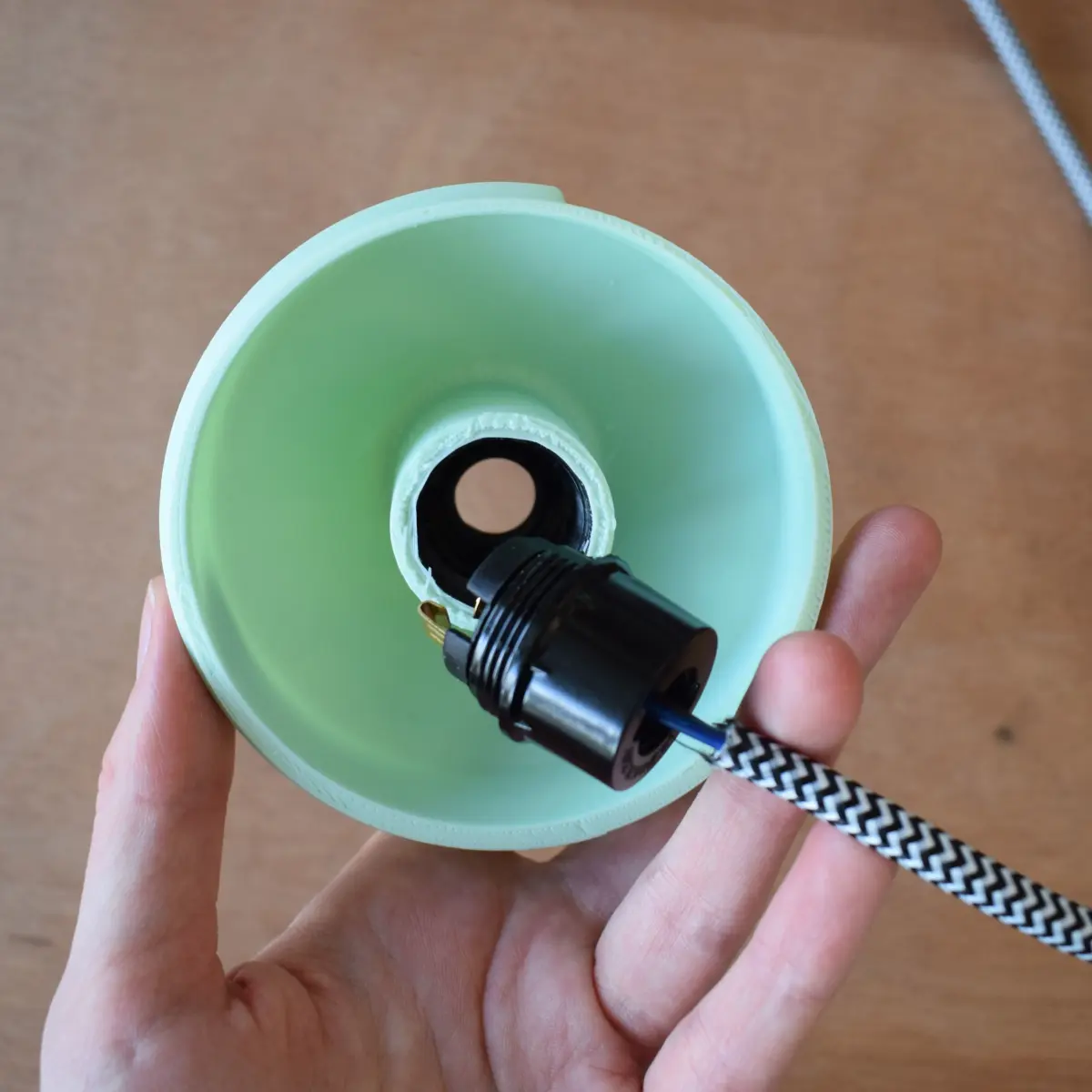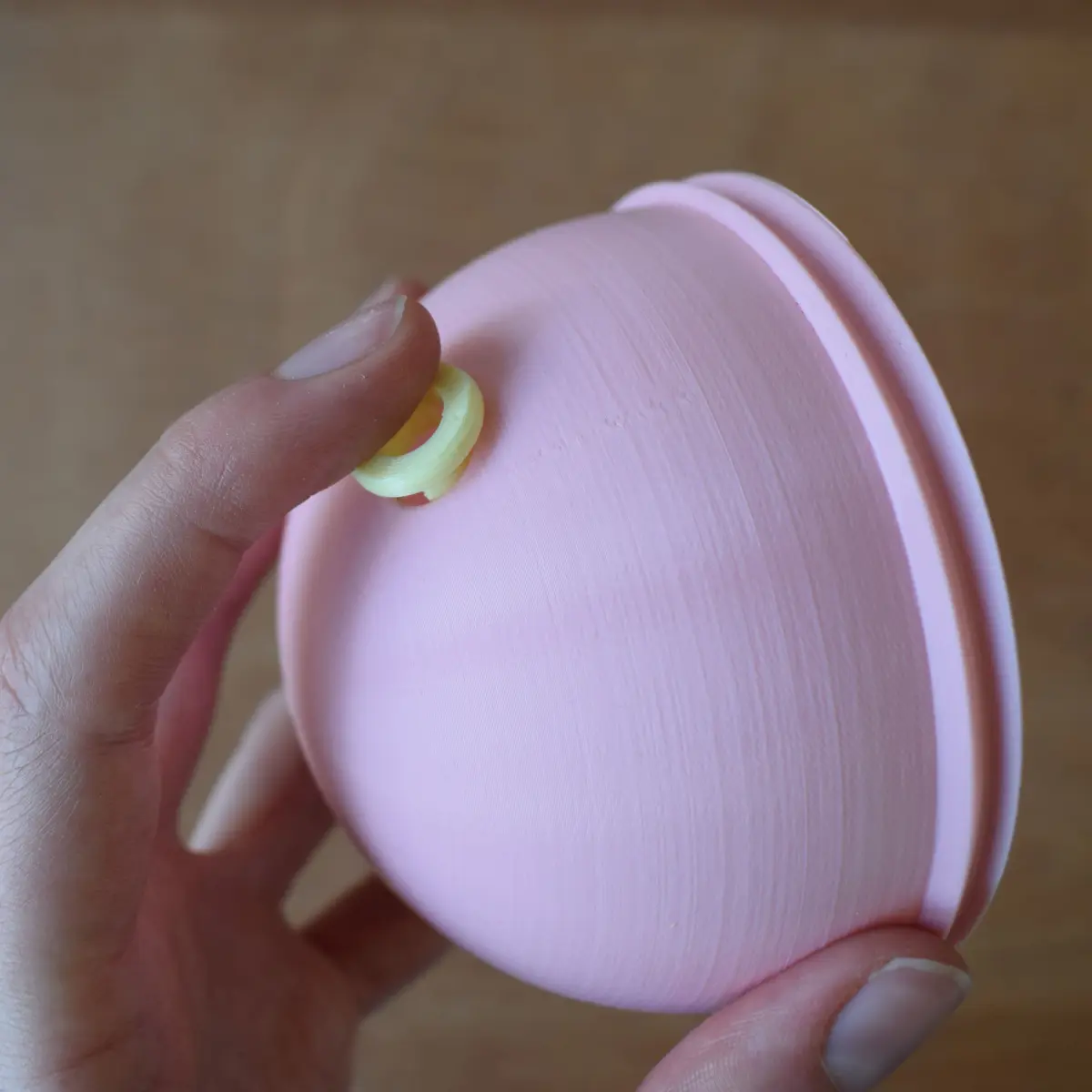 Assembly: the top and bottom piece are held together by a screw system with yellow ring. First screw the ring on the top part until the end (there is a stop) then come screw the bottom part.