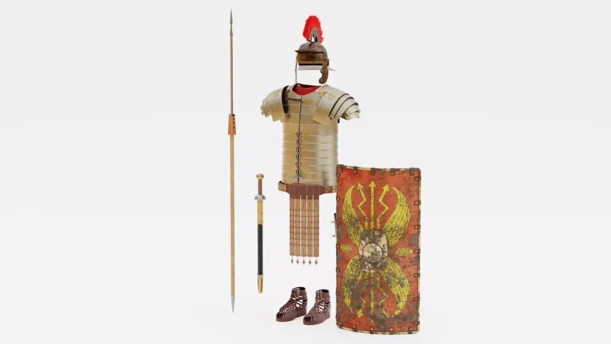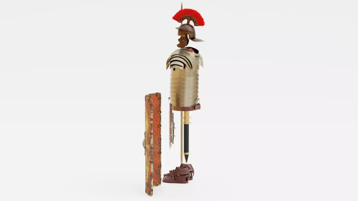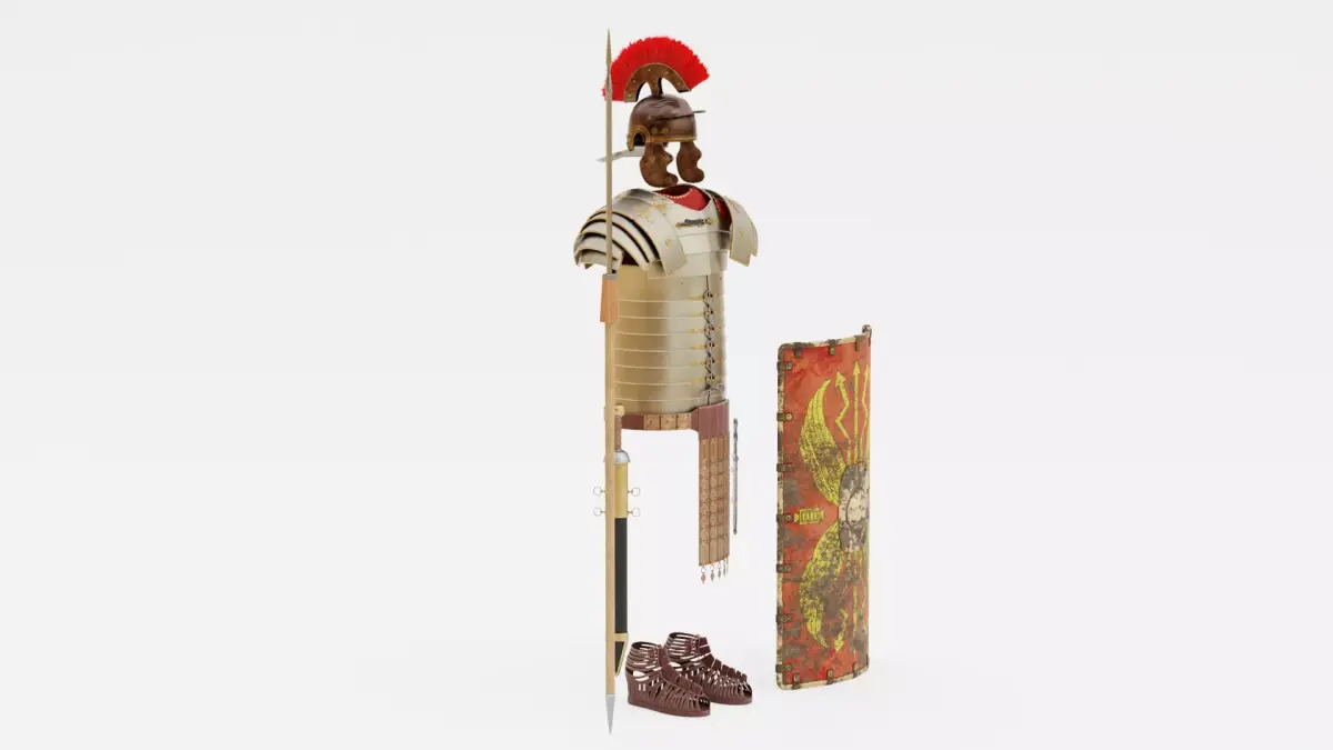 Aged Roman legionary armor set, showing realistic wear and use from the battlefield. Each piece features patinated metal, worn leather, and subtle dirt on the caligae and shield, with hand-painted shield designs slightly weathered for authenticity. The lorica segmentata, helmet, belt, and gladius reflect natural darkening and minor surface imperfections, while materials retain realistic textures and proportions. Subtle wear, folds, and patina enhance authenticity while maintaining historically accurate proportions across all components, making this a high-quality historical military asset.