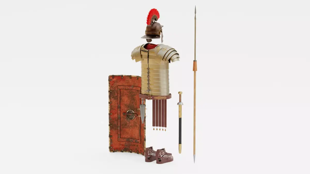- Includes: lorica segmentata, helmet, belt, scutum shield, dagger with sheath, tunic, javelin, caligae sandals, gladius sword