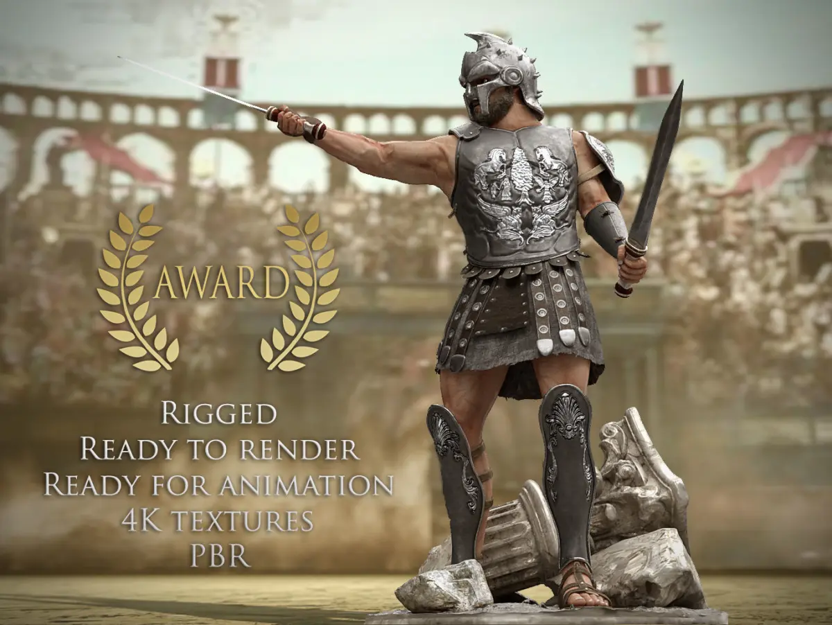 This is an high quality realistic character 3D model of an Ancient Roman Warrior Gladiator, inspired by the character Maximus from the movie The Gladiator.