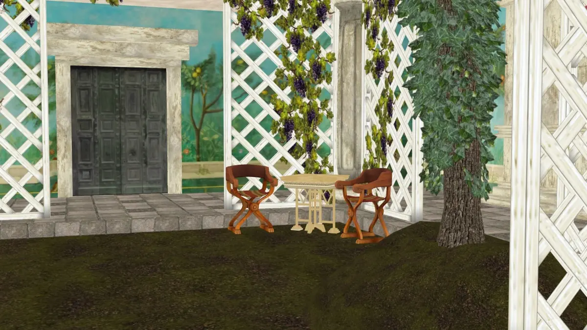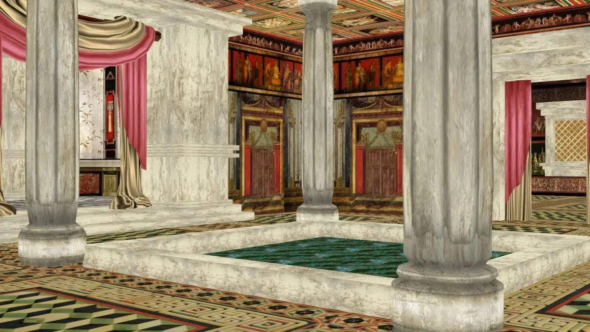 This Villa features 2 floors with magnificent indoor garden surrounded by the beautiful Livia's Garden Roman Fresco. The Main hall is flanked by two front rooms, each with access to the stairs to the 2nd floor balcony and 2 upstairs rooms. Through a beautifully appointed central hall is the garden, surrounded by 5 rooms, 4 of which have doors, the 5th for more public entertaining of guests. A beautiful living arrangement for nobles who love to entertain!