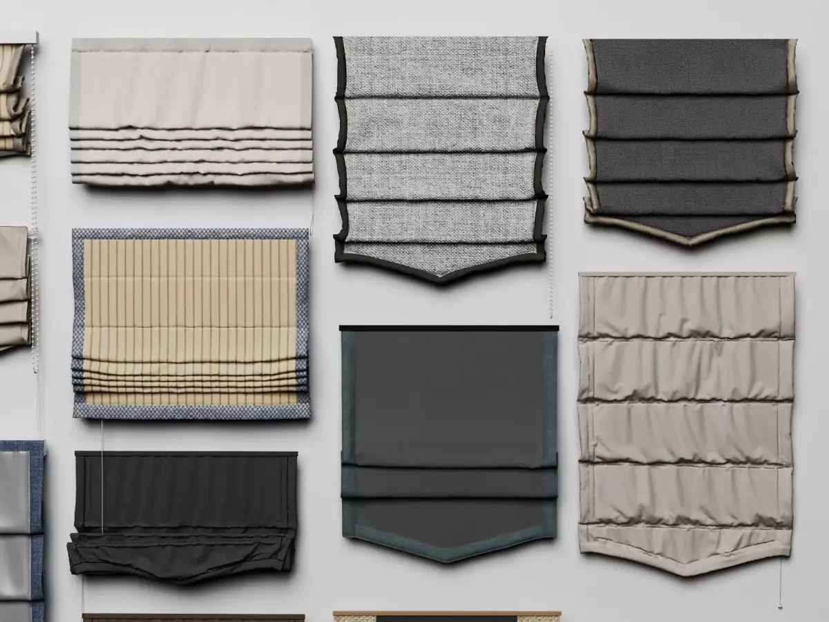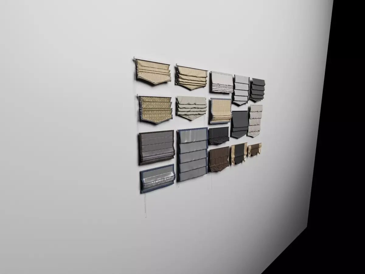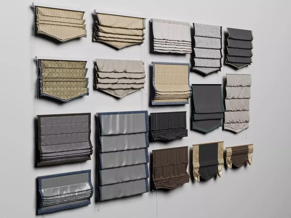 High-quality photorealistic 3D model collection of roman shades / pleated blinds for windows. This pack features a wide variety of roman shades in neutral and earthy tones (beige, taupe, gray, brown, linen, striped, patterned, solid fabrics) with different pleat styles, valances (straight, scalloped, banded), lift cords, and fabric textures including linen, cotton, silk-like, blackout options. Models show realistic folds, soft shadows, stitched edges, and subtle material variations for authentic window treatments.Perfect for architectural visualization, interior design rendering, home decor scenes, furniture/e-commerce presentations, game environments (Unity/Unreal Engine), VR/AR projects, or window covering mockups.Key features: