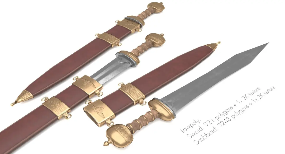 This roman sword (Gladius) is made in Blender 2.78c. The materials are created in Substance. The exported textures were reimported in Blender and setup using the PBR workflow metallic/roughness. The model can be used in broadcast, advertising, realistic (game) environments. Model is built to real-world scale - the unit system is metric – and has a length of approx. 69 cm. No third-party renderer or plug-ins needed.| Mesh Specs |