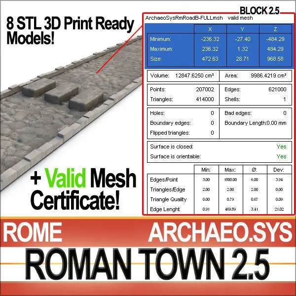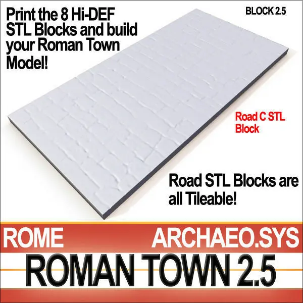 Accurate Reconstruction of Ancient Roman Town Roads A [Block 2.5], according to Scientific Data/Archaeological Evidence. 31 Textures, 8 Models Low Poly. 8 Hi-DEF STL Models Print Ready with Valid Mesh Certificate.__________________________________________8 3D Models Collection!Real World Scale Model [SmartCgArt Real World System]. Quads [C4D; OBJ] & Tris [VUE;3DS].Hi-DEF STL 3D Print Ready Mesh Files with Ready Validation Certificate.
