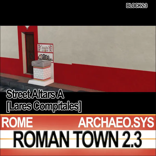 Faithful and accurate Reconstruction of the Ancient Roman Town Street Altars to the Lares Compitales [gods who protect the town roads][Block 2.3], according to Scientific Data and Archaeological Evidence. 9 Textures, 3 HiDEF Templates. Lo-Poly._____________________________Faithful and accurate Reconstruction of the Ancient Roman Town Street Altars to the Lares Compitales [the gods who guard and protect the Town roads and crossroads, i.e. the compita]. Each block [local communities or neighbourhoods] of the Roman Town, i.e. the vicus, had its own street altar on the road. The local Lares block leaders, the vicomagistri, prepared the celebration of the main Lares Compitales annual Festival, the Compitalia, with special Ludi Compitales [Compitales Games] and the other religious functions during the year. The Serpent represents the Earth or the Fields Genius Spirit offering fructifying or generative force. The sacrifice of a pig was common for the Lares Compitales. The Roadways gods, the Lares, can be seen in the frescoes as the symmetrical figures in a dancer's attitude, with one arm rising a drinking horn [rhyton] aloft.