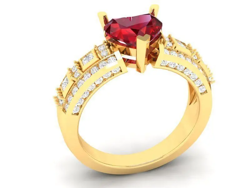 This 3D model features a romantic heart-cut gemstone ring for women, highlighted by baguette-cut side diamonds for a touch of modern luxury. The center stone is shaped like a heart, symbolizing deep affection and eternal love, while the side baguette stones enhance brilliance and structure. The ring design combines elegance with a contemporary charm, perfect for engagement or anniversary jewelry.
