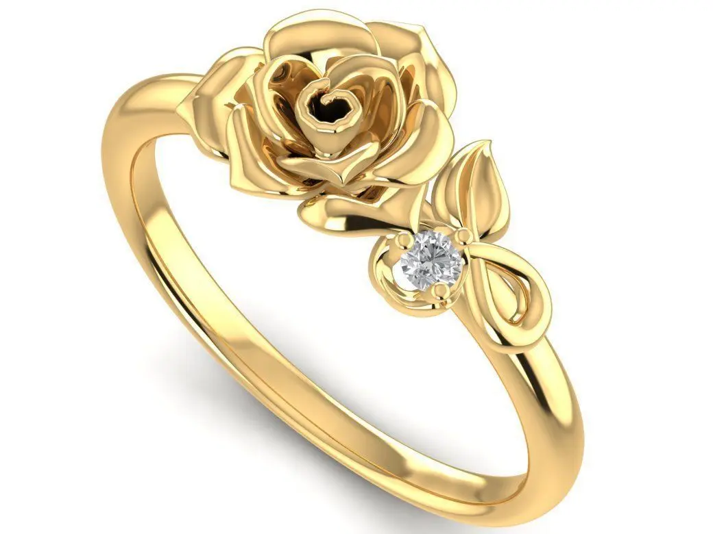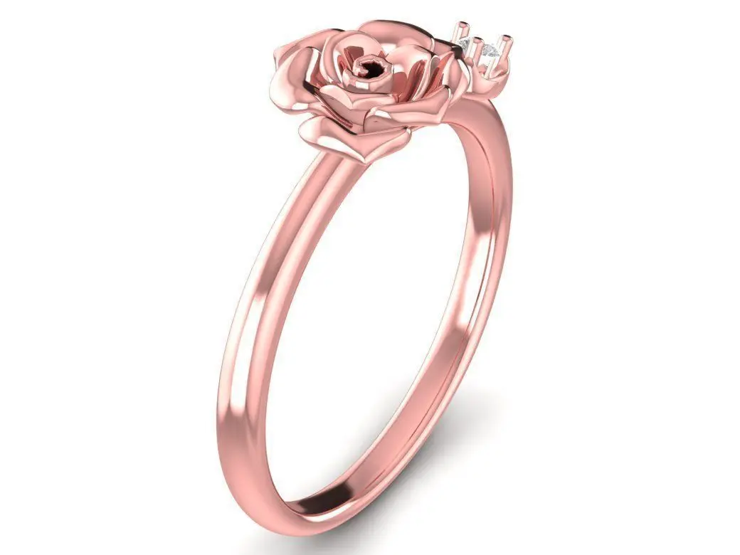 This 3D jewelry model features a romantic rose-shaped ring with a round-cut diamond delicately set beside the blooming flower.