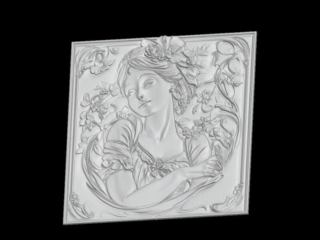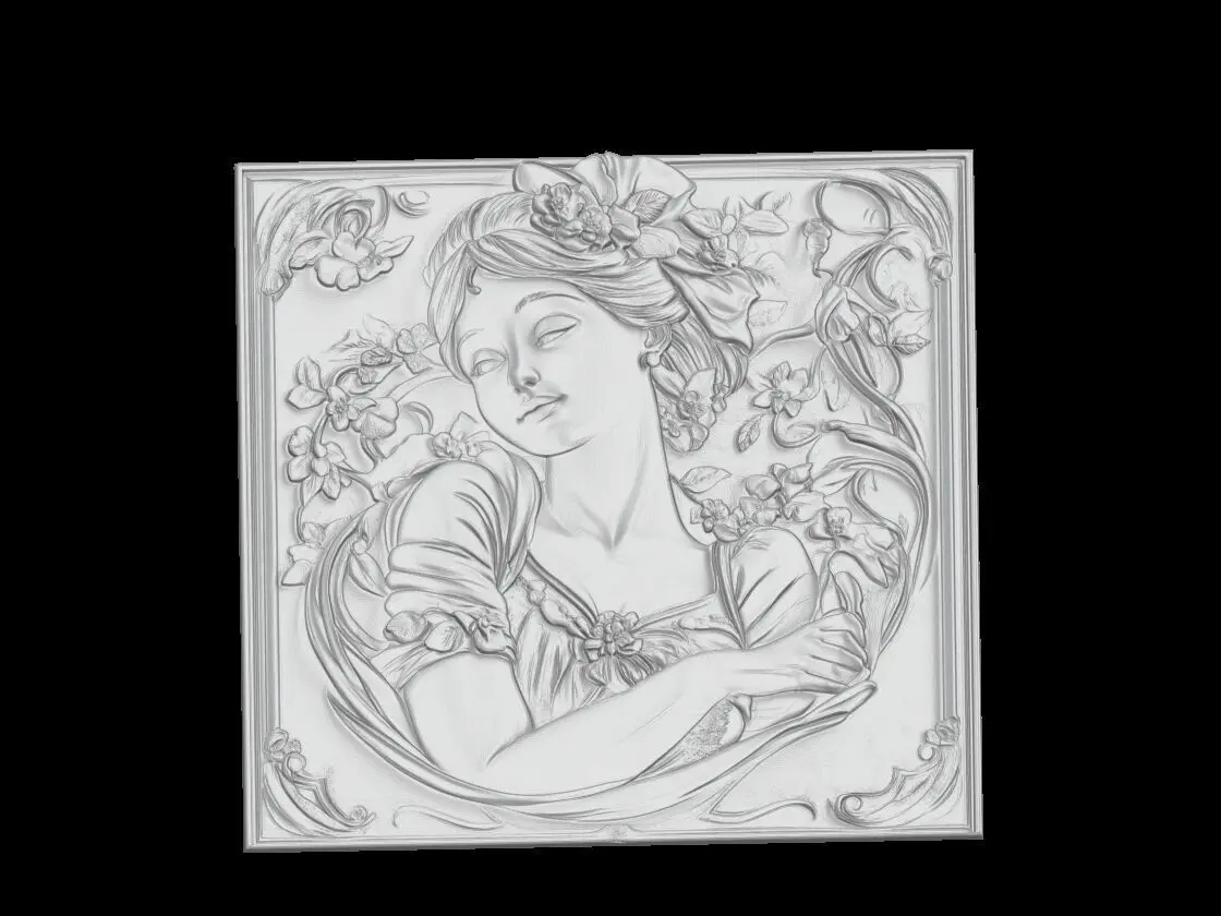 A beautifully detailed high-relief 3D carving of a romantic woman, surrounded by floral and ornamental elements. Designed for CNC engraving, laser etching, and depth map applications, this model offers a sophisticated and artistic touch, perfect for decorative and artistic projects.