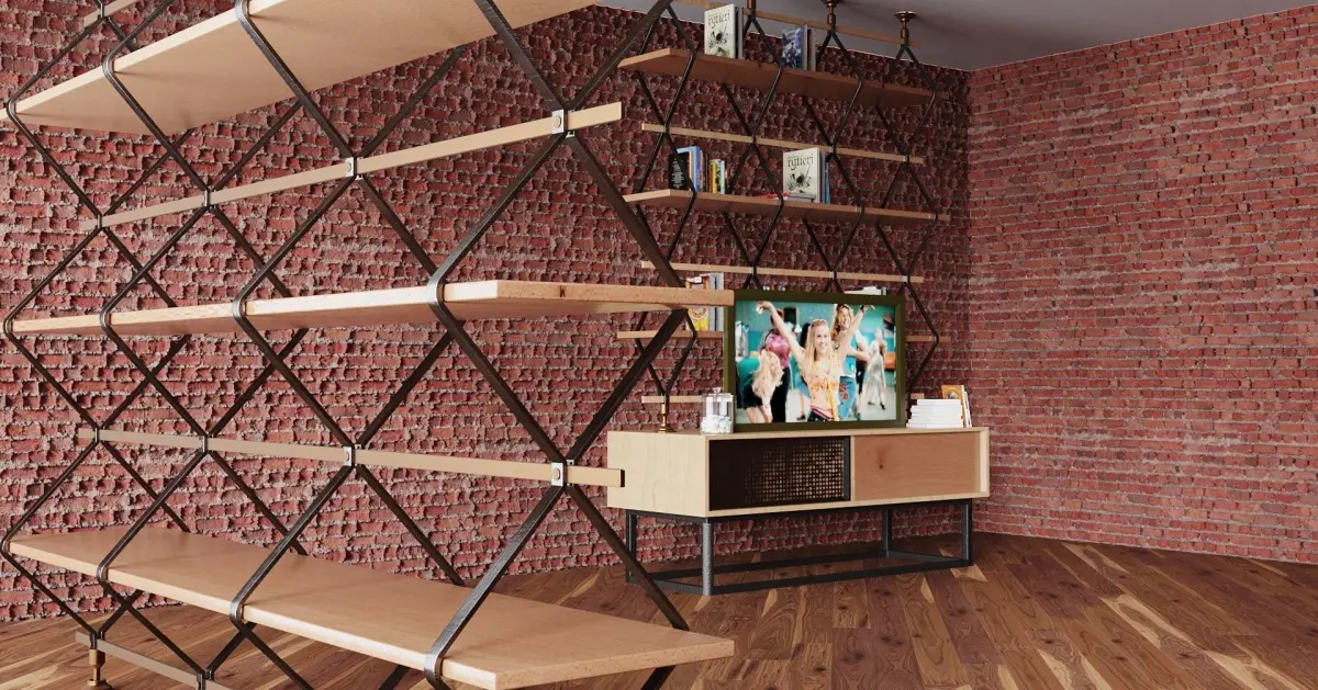 The second has a similar design, but was invented by me personally. She divides the space into zones. Can separate the TV area of the living room from the Bedroom or Dining Room. It consists of a bookcase and a loft-style TV stand.Models are distinguished by a laconic design, clear lines.For the model, materials typical for loft-style furniture were used - dark and light wood, black painted metal and bronze for small elements.Modular shelving systems are convenient and stylish furniture. Elements of shelving systems create simple geometric patterns, complimenting modern interior decorating. Elegant and familiar shapes add depth to interior decorating and create beautiful storage spaces.