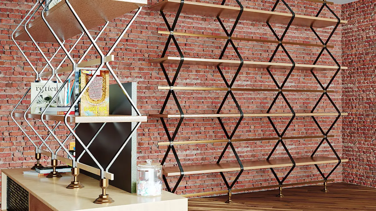 These modular shelving units allow to create functional zones and let plenty of light come into parts of a room. Diamond shapes, wood shelves and metal details bring various textures into interior decorating and enhance room design. Stylish and comfortable room dividers, these modular shelving systems stretch from the floor to the ceiling, creating lots of storage spaces which are functional and decorative.Small decor and books are also placed on the shelves of the rack.The modular shelving units Romboidale are created with straight lines. Comfortable black color, warm wood and bronze metal colors of hardware add softness to the design and balance interior decorating.Model parameters